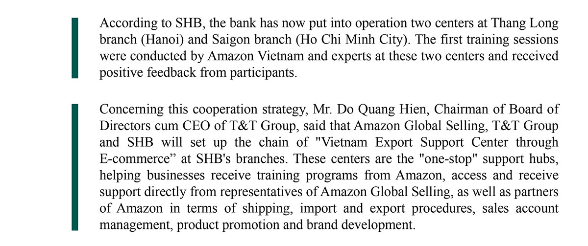 Another key point in the cooperation agreement of the parties is that Amazon Global Selling, T&T Group, SHB Bank will coordinate to implement long-term strategies in Vietnam in the program of establishing and operating the centers to support Vietnamese enterprises to export via e-commerce at SHB’s major branches nationwide.
