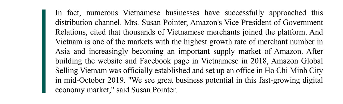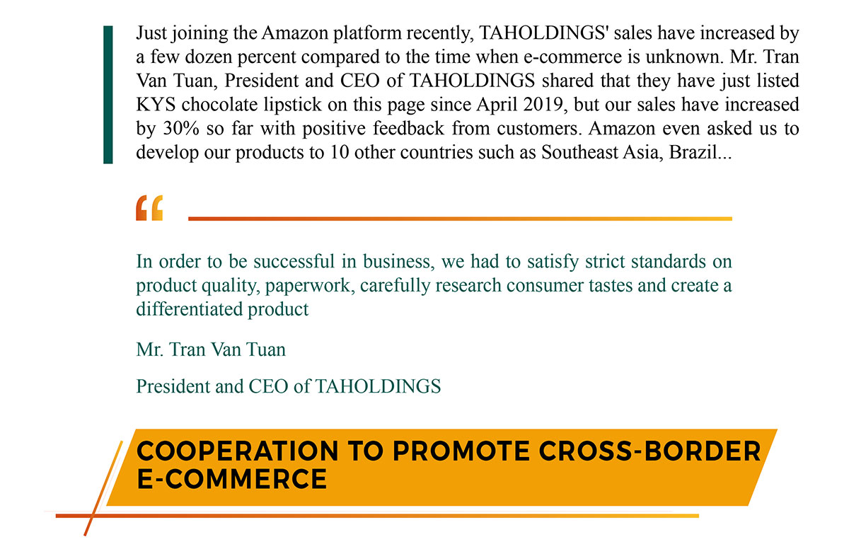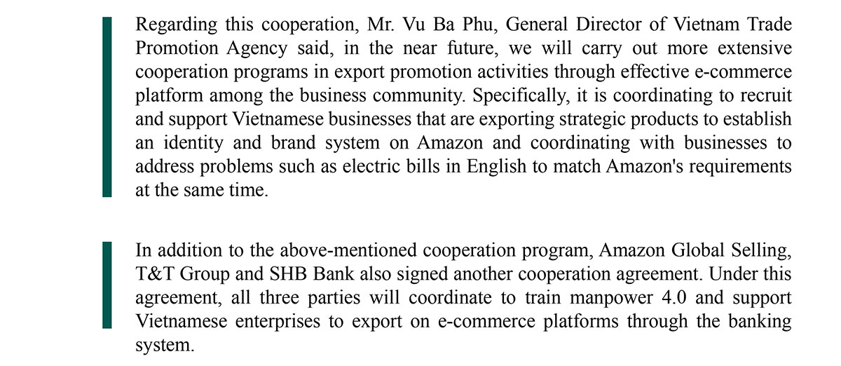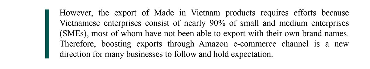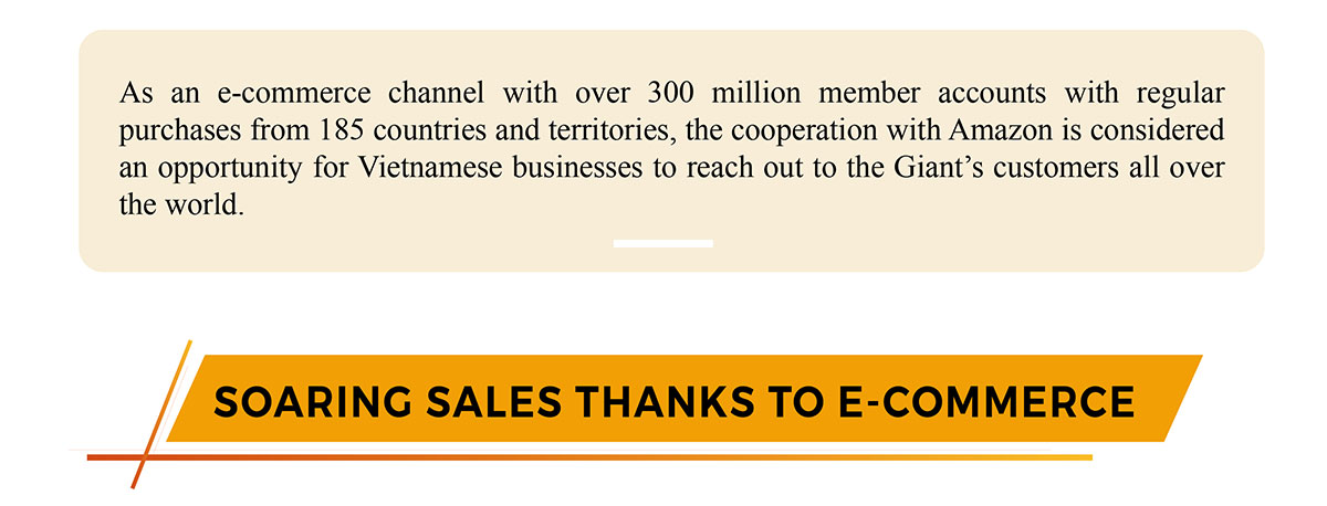 Sales through e-commerce platform have increased sharply, and brand has been gained in growing popularity in many countries and territories. Aware of the need for multi-stakeholder cooperation, the Vietnam Trade Promotion Agency (Ministry of Industry and Trade) and Amazon Global Selling have recently signed a Memorandum of Understanding (MoU) to support enterprises to boost global exports through e-commerce as well as researched Brand Development of Vietnamese enterprises on e-commerce with Amazon.
