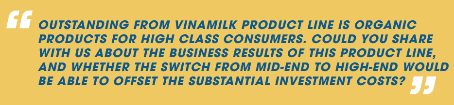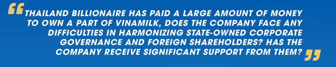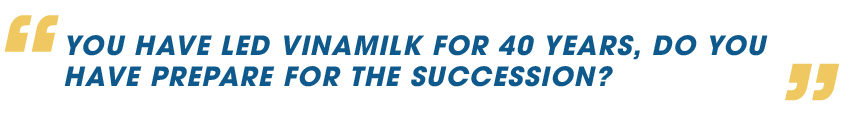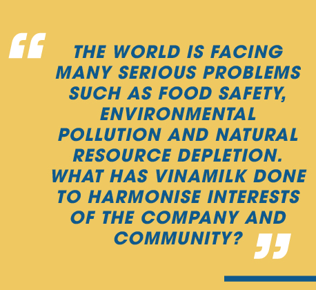 Actually, what Vinamilk has been now is attributed to sustainable development that means we not only think of our own interests but also others’. And we have followed sustainable development standards of the United Nations and the world milk sector. Vinamilk is required to comply with specific sustainable development standards of the milk sector.