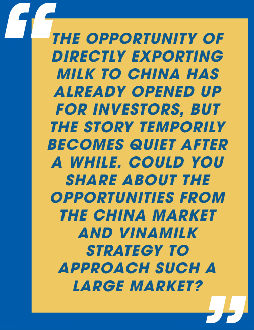 Arising opportunities need grasping. So far, China milk has not entered into our market and vice versa as there has been no trade agreement between two countries and they have considered us as the country with foot-and-mouth disease similar to Cambodia. Now, the trade agreement between the two countries is set to be signed after years. When they come to check Vietnam enterprises from farms to manufacturing plans, Vinamilk does not get any notice. We have proposed and waited for the agreement to be officially signed.