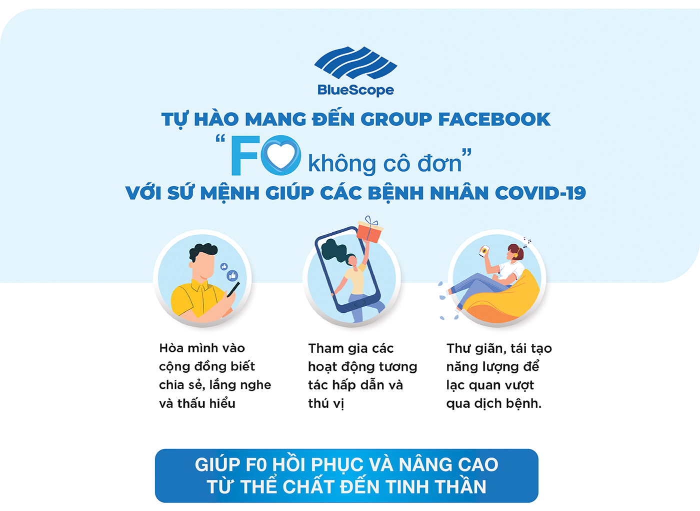 Chung tay vào cuộc chiến chống Covid-19 và hỗ trợ cho các bệnh nhân, BlueScope Việt Nam đã cùng các y bác sĩ, các nghệ sĩ tạo ra Group Facebook “F0 không cô đơn” – Cộng đồng trực tuyến nhằm tạo một môi trường tích cực để hỗ trợ cho các bệnh nhân qua các hoạt động tương tác hấp dẫn và thú vị. Đây sẽ là cơ hội lý tưởng để các F0 được thư giãn, tái tạo năng lượng để lạc quan vượt qua dịch bệnh. Cho đến nay, “F0 không cô đơn” là nhóm cộng đồng duy nhất không chỉ cung cấp thông tin tư vấn sức khoẻ mà còn mang đến các hoạt động giải trí giúp FO, F1 nâng cao thể chất và tinh thần với nhiều hoạt động đặc biệt.