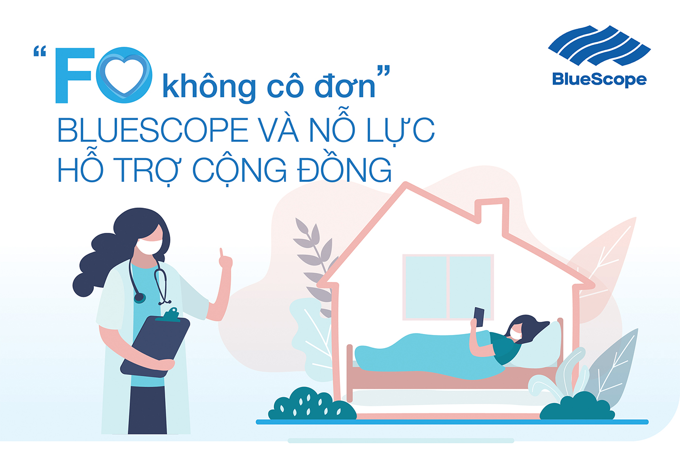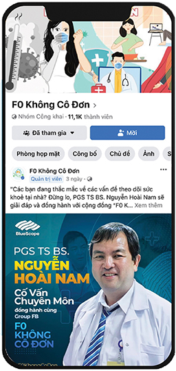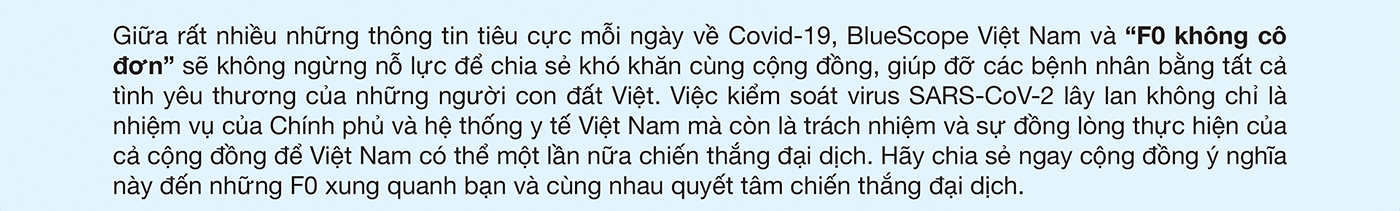 Chung tay vào cuộc chiến chống Covid-19 và hỗ trợ cho các bệnh nhân, BlueScope Việt Nam đã cùng các y bác sĩ, các nghệ sĩ tạo ra Group Facebook “F0 không cô đơn” – Cộng đồng trực tuyến nhằm tạo một môi trường tích cực để hỗ trợ cho các bệnh nhân qua các hoạt động tương tác hấp dẫn và thú vị. Đây sẽ là cơ hội lý tưởng để các F0 được thư giãn, tái tạo năng lượng để lạc quan vượt qua dịch bệnh. Cho đến nay, “F0 không cô đơn” là nhóm cộng đồng duy nhất không chỉ cung cấp thông tin tư vấn sức khoẻ mà còn mang đến các hoạt động giải trí giúp FO, F1 nâng cao thể chất và tinh thần với nhiều hoạt động đặc biệt.