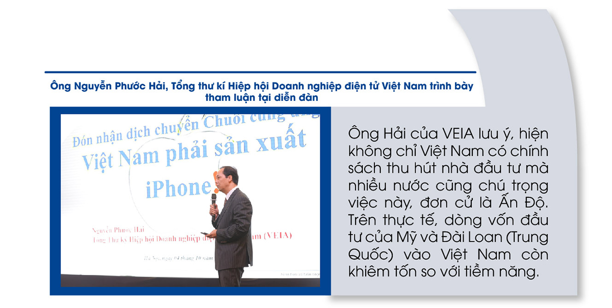 Còn ông Liêu Văn Hán, Chủ tịch Hiệp hội doanh nghiệp Điện tử Đài Loan tại Việt Nam cho rằng, ngành công nghiệp điện tử với linh kiện phức tạp và chủng loại sản phẩm đa dạng. Các doanh nghiệp Việt để có thể tham gia chuỗi cung ứng toàn cầu không phải dễ dàng và thời gian ngắn là đạt được. Quá trình đạt được tiêu chuẩn chất lượng của chuỗi cung ứng toàn cầu rất phức tạp, nên ông cho rằng chính phủ Việt nam cần có chính cách thúc đẩy phù hợp.