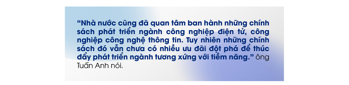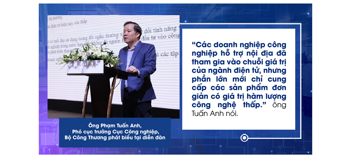 Hiện tại, công nghiệp điện tử được đánh giá là ngành công nghiệp mũi nhọn và xuất khẩu xếp thứ 12 trên thế giới và xếp thứ 3 khu vực ASEAN. Tuy nhiên, ông Tuấn Anh cho hay, có đến 95% kim ngạch xuất khẩu thuộc khối doanh nghiệp có vốn đầu tư nước ngoài. Ngành điện tử vẫn dừng ở công đoạn lắp ráp. Năng lực của các doanh nghiệp nội địa trong ngành còn nhiều hạn chế, chất lượng mẫu mã sản phẩm chưa đáp ứng được yêu cầu cao của thị trường. Một số doanh nghiệp điện tử nội địa có tiếng trước đây phát triển chậm lại hoặc mất dần thương hiệu, chiếm thị phần nhỏ…