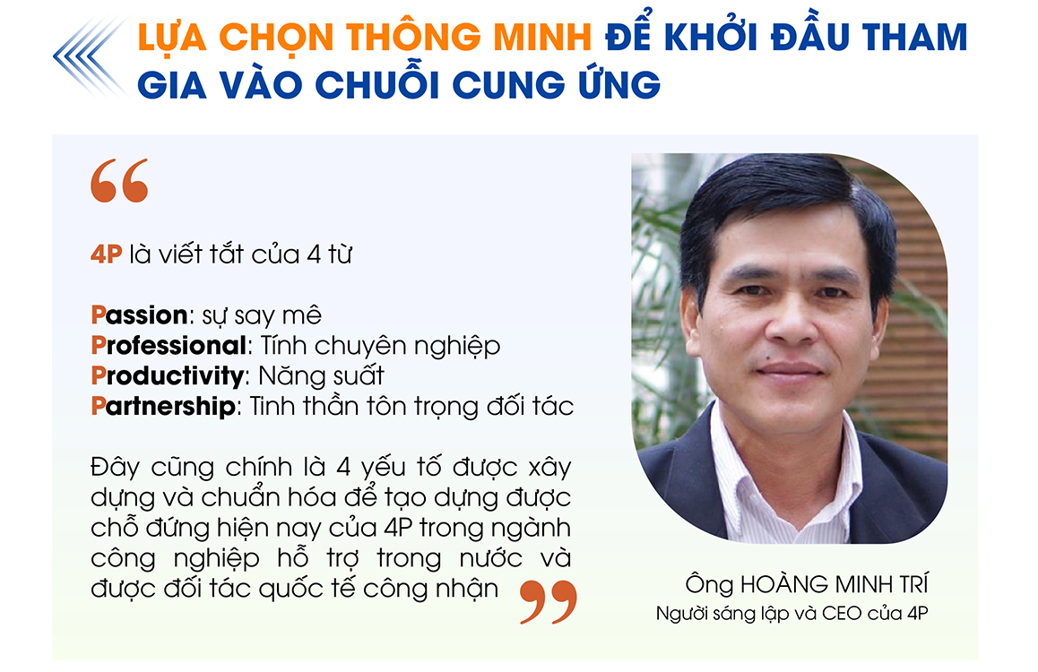 Có nền tảng là sự hiểu biết về những yêu cầu khắt khe từ các khách hàng lớn, ông Trí định hướng 4P sẽ chỉ tập trung đầu tư vào một số công đoạn và công nghệ sản xuất nhất định để làm nền tảng, từ đó bắt đầu tham gia vào chuỗi cung ứng. Ở thời điểm làn sóng FDI thứ ba vừa vào Việt Nam, lựa chọn đầu tư để phục vụ các sản phẩm công nghệ cao được xem là mạo hiểm. Tuy nhiên, sau hơn hai thập kỷ, những thành tựu 4P đạt được đã chứng minh họ có lựa chọn khôn ngoan.