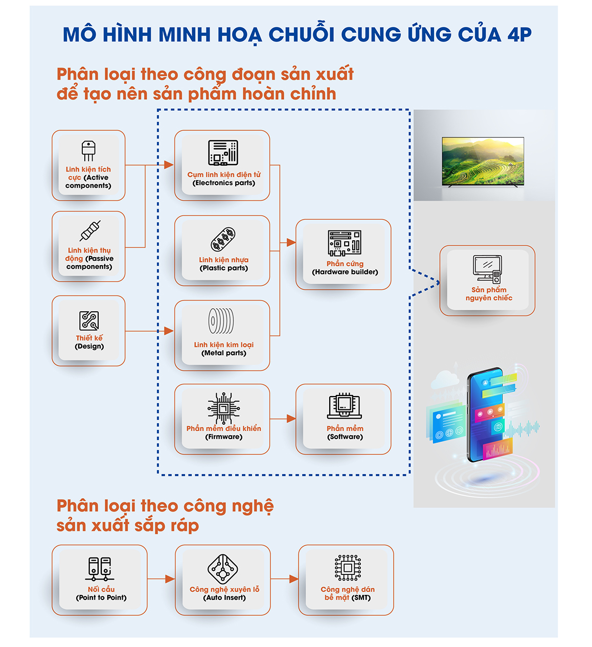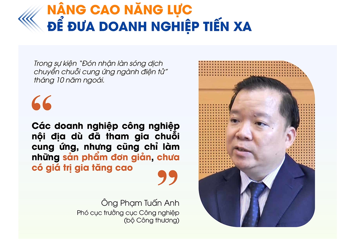 Ông Tuấn Anh cũng thừa nhận một thực tế, các doanh nghiệp ngành điện tử Việt Nam đang ở công đoạn lắp ráp trong chuỗi sản xuất sản phẩm điện tử. Điều này đồng nghĩa, năng lực của nhóm doanh nghiệp nội địa chưa thể đáp ứng được nhu cầu ngày một tăng của thị trường. Một trong những lý do là do các sản phẩm điện tử có tuổi thọ tương đối ngắn, thường xuyên cần cập nhật tính năng và mẫu mã, nhưng không phải doanh nghiệp nội địa nào cũng đủ nguồn lực để đầu tư vào công tác nghiên cứu phát triển sản phẩm mới và phát triển thương hiệu.