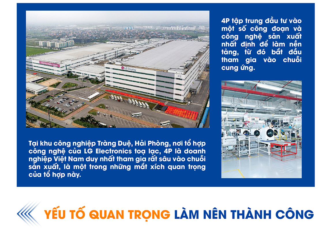 Sau khi lựa chọn công đoạn sản xuất để đầu tư, công ty 4P đưa ra một số mục tiêu để hướng tới: Sản xuất, lắp ráp các sản phẩm công nghệ cao, đẩy mạnh ứng dụng công nghệ cao, liên tục đổi mới … Tại khu công nghiệp Tràng Duệ, Hải Phòng, nơi tổ hợp công nghệ của LG Electronics toạ lạc, 4P là doanh nghiệp Việt Nam duy nhất tham gia rất sâu vào chuỗi sản xuất, là một trong những mắt xích quan trọng của tổ hợp này.