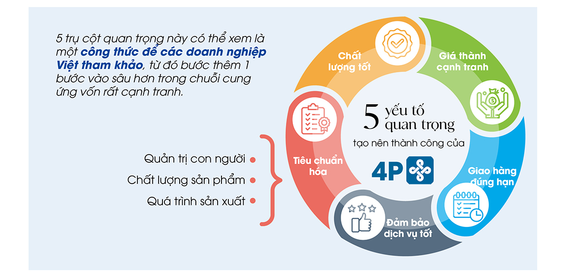 Trong một lần xuất hiện tại sự kiện“Đón nhận làn sóng dịch chuyển chuỗi cung ứng ngành điện tử”, được đồng tổ chức bởi NS BlueScope Việt Nam và Thời báo Kinh Tế Sài Gòn, ông Trí từng chia sẻ về mô hình vòng tròn khép kín, bao gồm 5 yếu tố: Tiêu chuẩn hoá, chất lượng tốt, giá thành cạnh tranh, giao hàng đúng hạn và đảm bảo dịch vụ tốt. Đây là 5 trụ cột quan trọng đã tạo nên thành công của 4P nói riêng, và có thể xem là một công thức để các doanh nghiệp Việt tham khảo, từ đó bước thêm 1 bước vào sâu hơn trong chuỗi cung ứng vốn rất cạnh tranh.