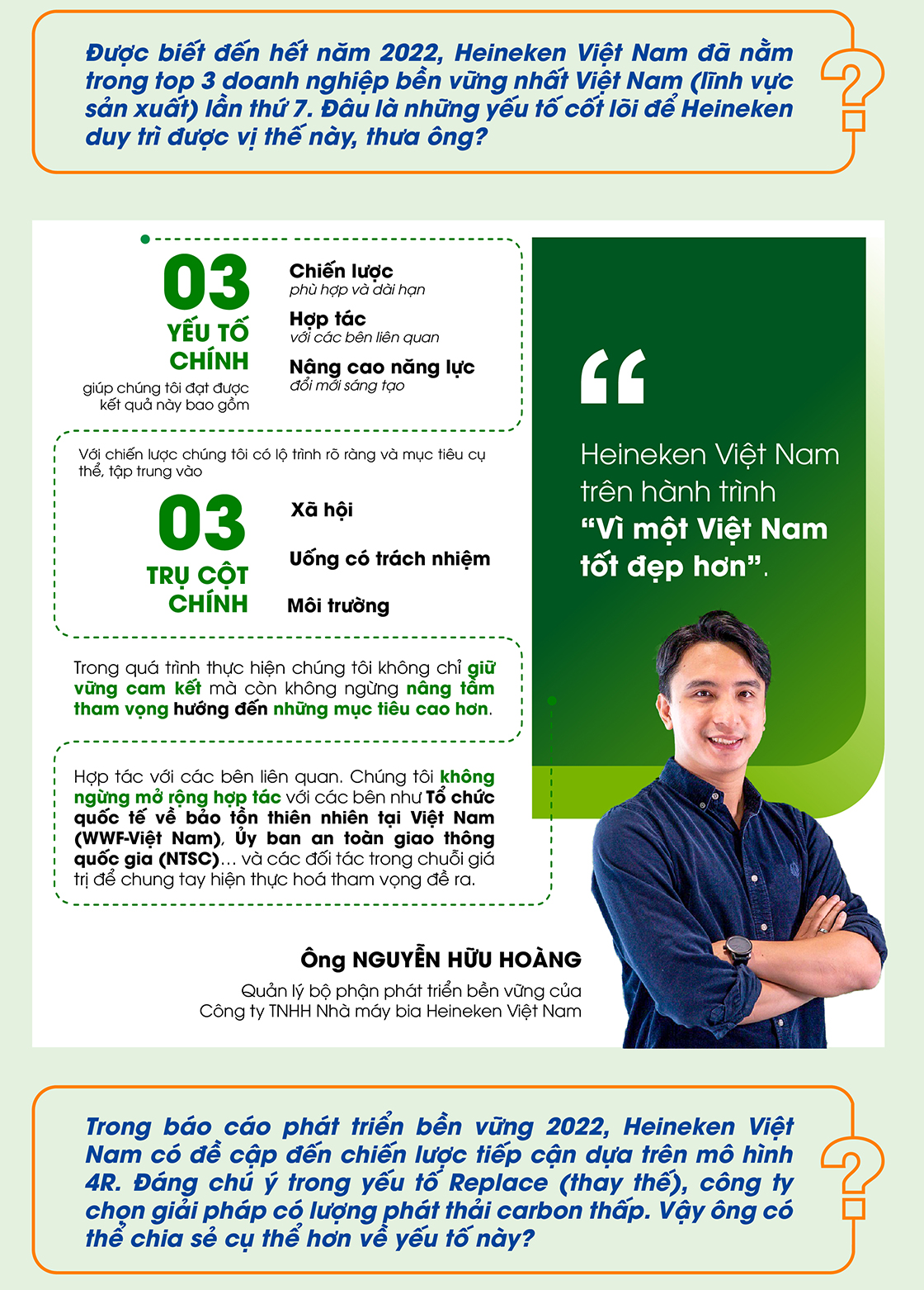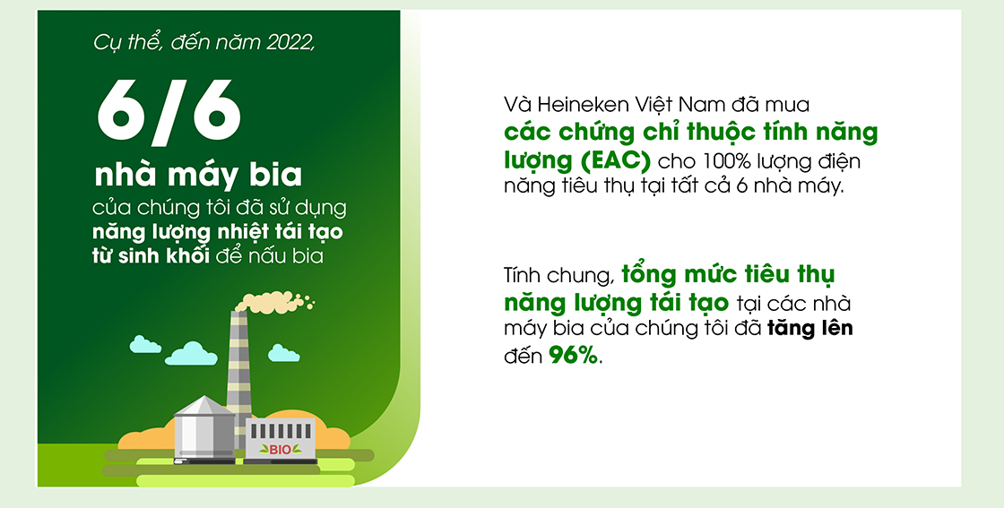 Đúng là tại Heineken Việt Nam, chúng tôi đặt ra tham vọng phải đạt mức phát thải ròng bằng “0” trong sản xuất vào năm 2025 với mô hình 4R bao gồm: Reduce (giảm thiểu), Replace (thay thế), Remove (loại bỏ) và Report (báo cáo). Trong đó đặc biệt yếu tố thay thế, chúng tôi thay thế các năng lượng hoá thạch bằng năng lượng tái tạo hoặc các giải pháp có lượng phát thải carbon thấp.