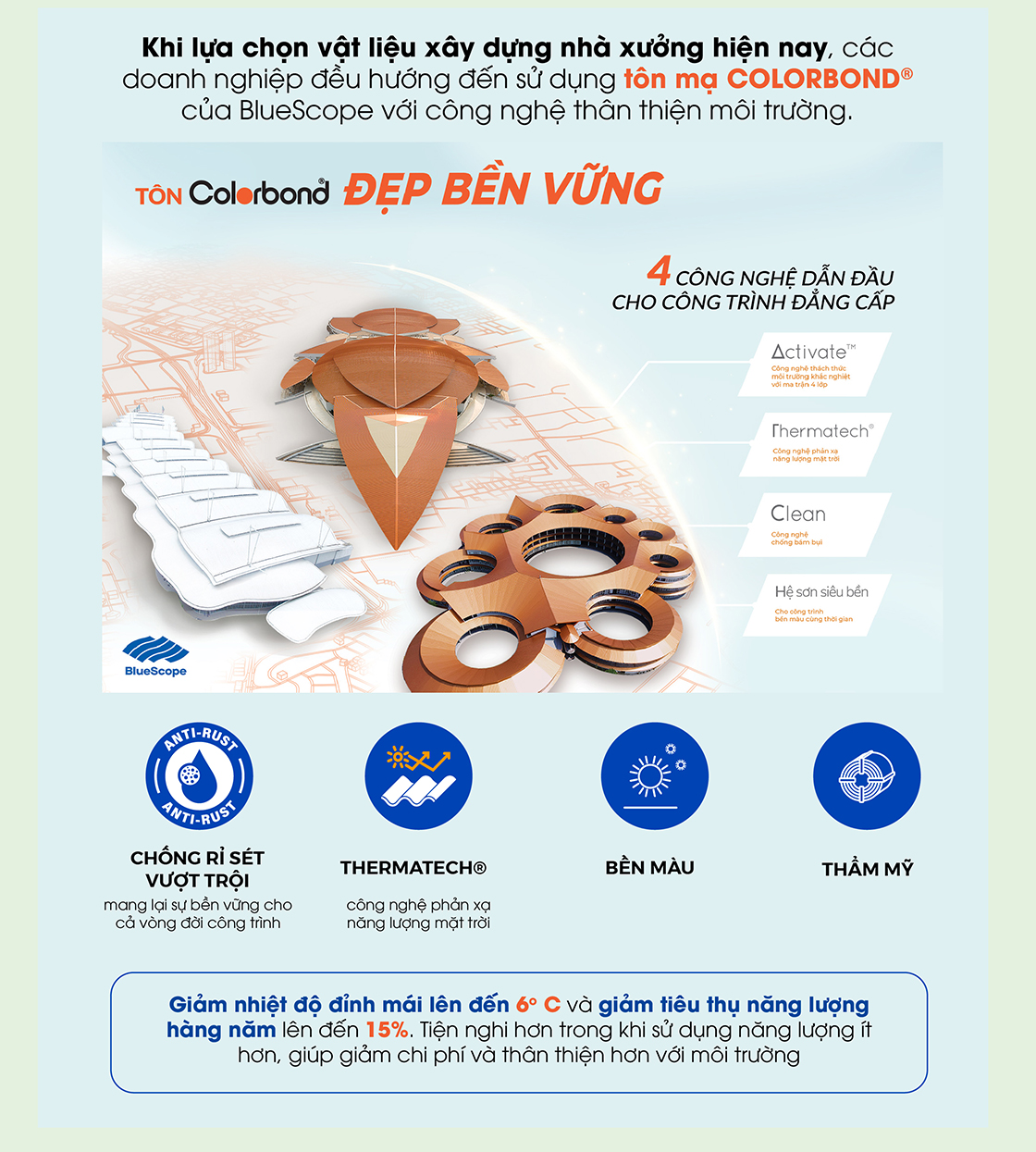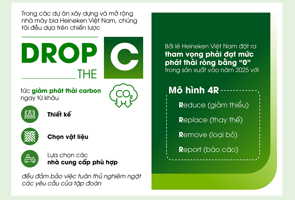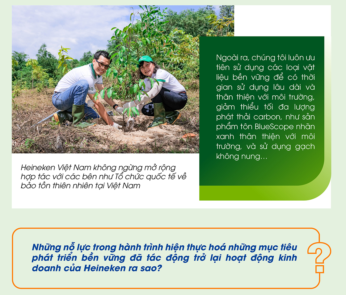 Trên thực tế, trong các dự án xây dựng và mở rộng nhà máy, chúng tôi đều dựa trên chiến lược “Drop the C”, tức giảm phát thải carbon ngay từ khâu thiết kế, chọn vật liệu, lựa chọn các nhà cung cấp phù hợp… đều đảm bảo việc tuân thủ nghiêm ngặt các yêu cầu của tập đoàn. Ví dụ như tại nhà máy Heineken Vũng Tàu, trên tổng diện tích 40ha của nhà máy, thì có hơn 10ha (27%) được quy hoạch cho cây trồng và không gian xanh. Bên cạnh, nhằm tận dụng tối đa ánh sáng và không khí tự nhiên, nhà máy cho lắp đặt 615 vòm lấy sáng trên mái các tòa nhà. Giải pháp này giúp giảm thiểu năng lượng dùng để chiếu sáng, đồng thời cho phép không khí lưu thông trong các khu vực sản xuất…