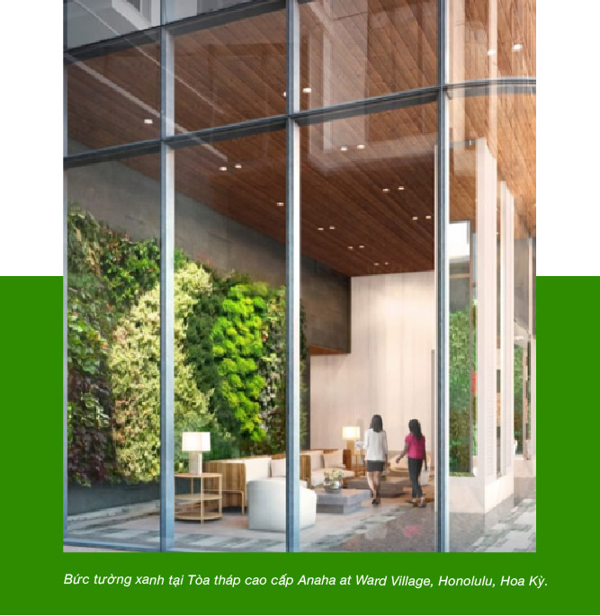 Những khu vườn thẳng đứng bên trong không gian sống, hay còn được gọi là những bức tường xanh sống động, hiện đang trở thành lựa chọn yêu thích của người mua nhà trên toàn cầu. Và có thể thấy, thời hoàng kim của môi trường xây dựng truyền thống với bê-tông, cốt thép đã qua, nhường chỗ cho những không gian xanh mát, nơi những khu vườn quy mô lớn được tích hợp trên bề mặt những bức tường bên trong hoặc bên ngoài để kết nối cư dân đô thị với thiên nhiên. Ngoài chức năng trang trí đơn thuần, thảm xanh của cỏ cây còn giúp làm mát không khí và hấp thụ tiếng ồn, mang đến cảm giác bình yên về một cuộc sống tự tại giữa thiên nhiên ngay giữa lòng đô thị náo nhiệt. Anaha at Ward Village, khu cư dân cao cấp ở Honolulu, Hoa Kỳ, đã sử dụng 8000 cây dứa cảnh, dương xỉ và tróc bạc để tạo nên bức tường xanh bên trong toà nhà, mang lại trải nghiệm độc đáo về một không gian chan hoà với thiên nhiên. Giá bán trung bình một căn hộ tại đây khoảng 3.4 triệu USD.