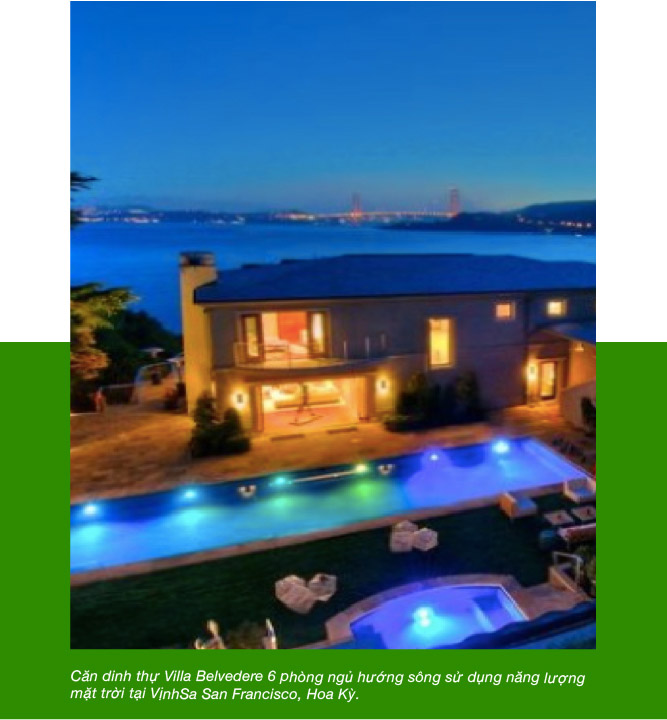 Villa Belvedere là một dinh thự ven sông 6 phòng ngủ sử dụng năng lượng mặt trời và là một trong những bất động sản có giá cao nhất Bay Area thuộc vịnh San Francisco, Mỹ. Các tính năng xanh của Villa Belvederes bao gồm việc tích hợp công nghệ thông minh để chủ nhân có thể quản lý năng lượng hiệu quả từ xa bằng điện thoại di động hoặc trực tuyến. Căn biệt thự này hiện có giá bán 45 triệu USD.