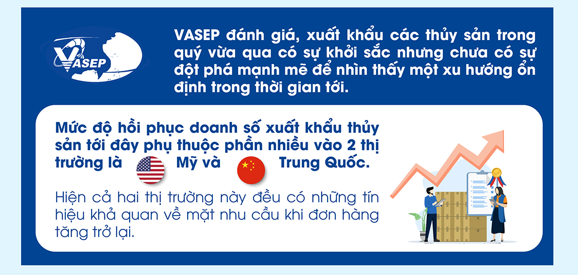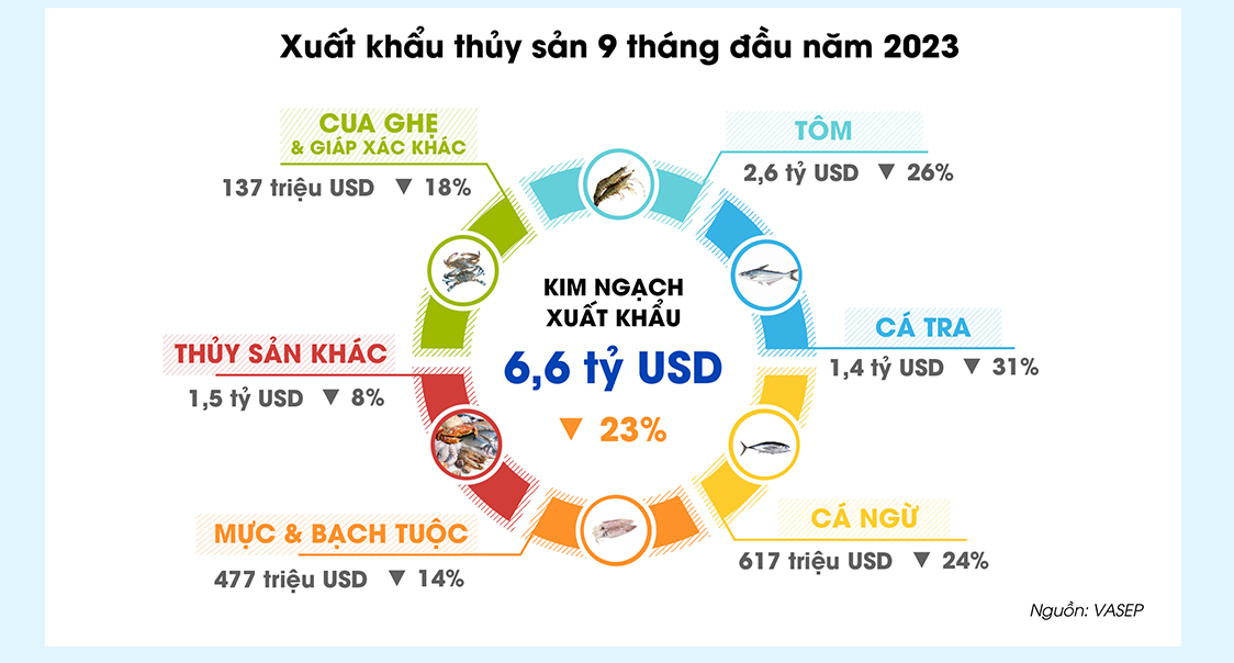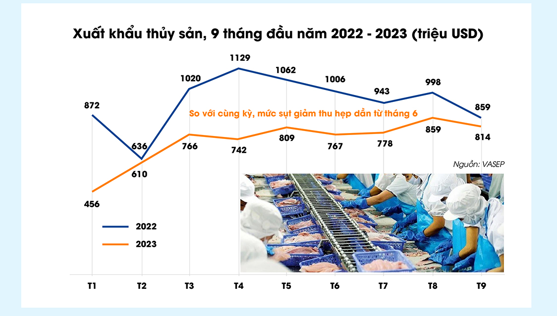 VASEP cho biết 9 tháng đầu năm nay, xuất khẩu thủy sản cả nước đạt 6,6 tỷ USD, giảm 22,6% so với cùng kỳ năm ngoái. Trong đó, xuất khẩu giảm sâu trong giai đoạn nửa đầu năm với 27%. Từ tháng 6 trở đi tăng trưởng âm thu hẹp dần. Riêng trong tháng 9, doanh số xuất khẩu chỉ còn thấp hơn 5% so với cùng kỳ năm ngoái.