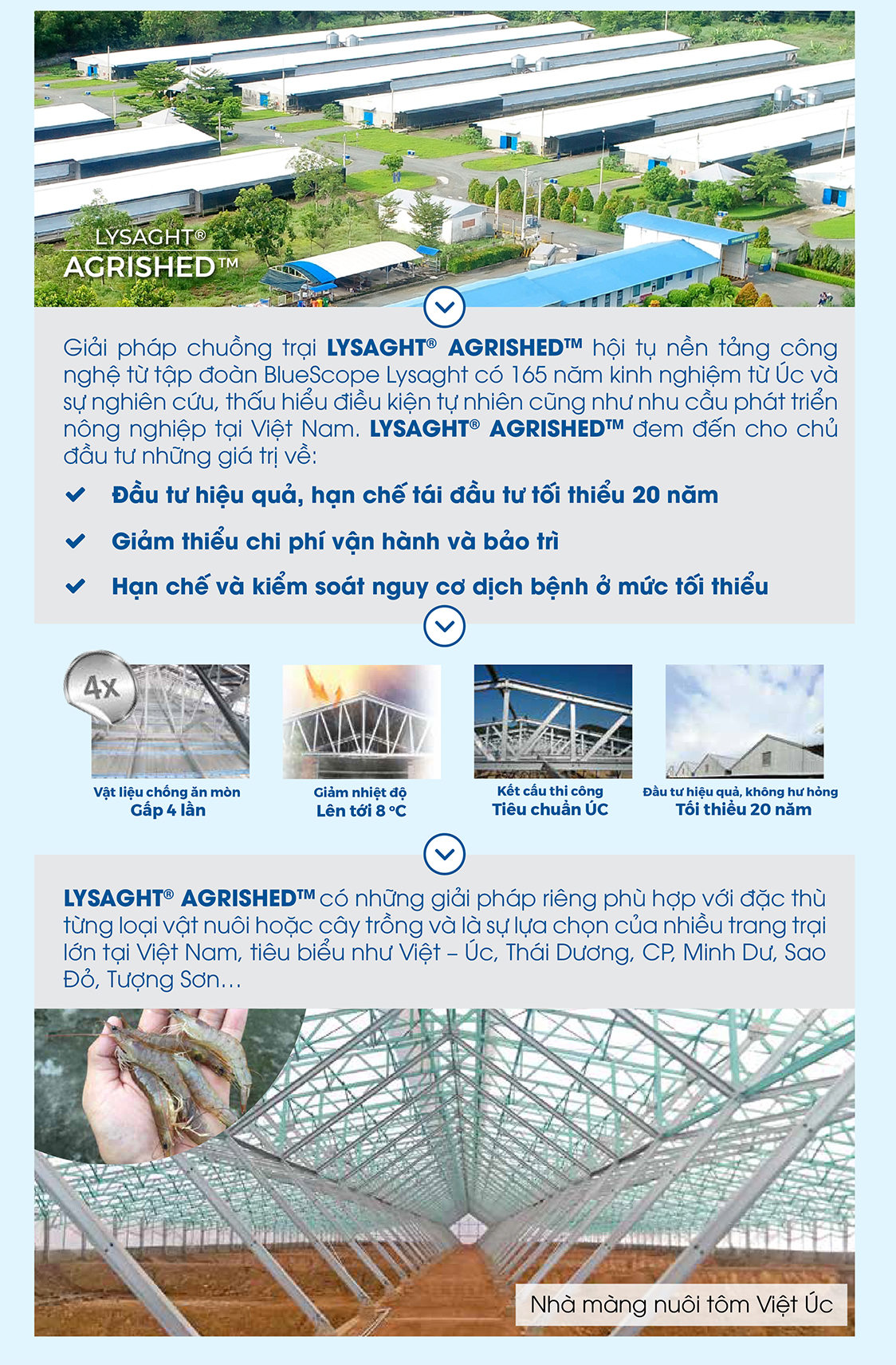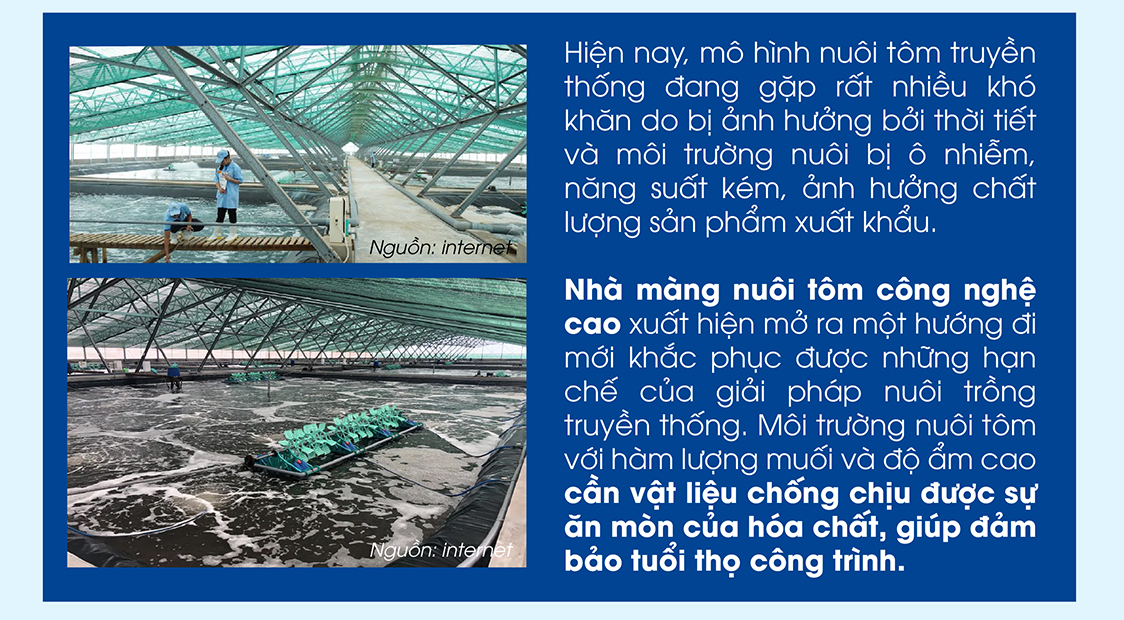 Ngoài việc sử dụng màng chất lượng cao đáp ứng các yêu cầu về độ truyền sáng, chống tia UV thì yếu tố về những liên kết để đảm bảo hệ màng hoạt động ổn định trong điều kiện gió mạnh của trại tôm cũng rất quan trọng. Đặc biệt các liên kết phải đồng bộ về chất lượng cũng như được kiểm nghiệm đầy đủ. Tùy theo quy mô nuôi tôm và kích thước hồ nuôi mà hệ khung nhà màng cần vượt nhịp lớn. Chính vì vậy, việc thiết kế nhà màng phải vừa đảm bảo chịu lực vừa tối ưu về mặt chi phí, giúp tăng hiệu quả kinh tế.