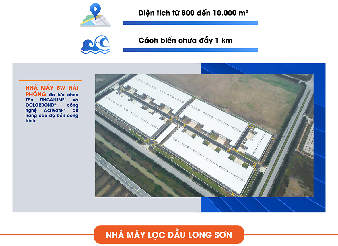 Với vị trí chiến lược kế bên cảng Hải Phòng – cửa ngõ hàng hải của miền Bắc để cung cấp các nhà xưởng cho thuê với diện tích từ 800 đến 10.000 m², đây là môi trường cách biển chưa đầy 1 km, khắc nghiệt và có tính ăn mòn cao, BW đã đưa ra những yêu cầu khắt khe với vật liệu xây dựng, phải đảm bảo được độ bền, đẹp, tuổi thọ cho công trình. Tôn COLORBOND® tích hợp công nghệ Activate™ đã được BW lựa chọn cho hệ bao che của công trình để chống chọi với tính ăn mòn cao của môi trường ven biển.
