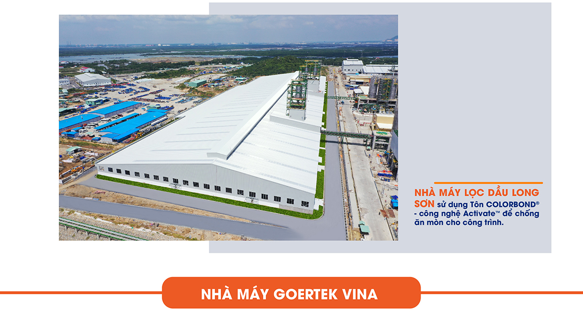 Nói đến các công trình đã tin tưởng ứng dụng tôn cao cấp tích hợp công nghệ Activate™ của BlueScope, không thể không kể đến dự án tổ hợp hóa dầu Long Sơn do Tập đoàn SCG (Thái Lan) làm chủ đầu tư với tổng vốn đăng ký khoảng 5,4 tỷ USD. Đây là một công trình tổ hợp “kép”” của các yếu tố ăn mòn, gồm cả môi trường cận biển và môi trường hóa chất. Vì vậy, công trình có yêu cầu nghiêm ngặt đối với vật liệu cho hệ bao che. Tôn Colorbond® công nghệ Activate™ là sự lựa chọn tối ưu của chủ đầu tư, giúp mang lại vẻ đẹp bền vững cho công trình trong môi trường khắc nghiệt này.