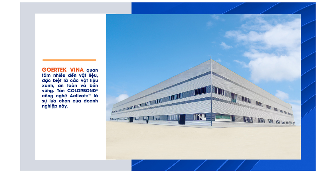 Đầu năm 2021, Goertek Vina – thành viên Tập đoàn Goertek là tập đoàn công nghệ cao hoạt động trong lĩnh vực nghiên cứu phát triển và sản xuất các thiết bị thông minh, chính xác đã đầu tư 100 triệu USD để xây dựng nhà máy tại Nghệ An. Goertek Vina quan tâm đến các vật liệu có thể tạo ra công trình bền vững với thời gian, có khả năng chống phai màu, được xây dựng theo xu hướng tiết kiệm năng lượng để tăng hiệu quả đầu tư, đảm bảo hoạt động sản xuất, chất lượng thiết bị. Doanh nghiệp này đã chọn tôn cao cấp COLORBOND® thế hệ mới tích hợp công nghệ Activate™ của BlueScope cho nhà máy Goertek để đáp ứng được các yêu cầu khắt khe của mình và đơn vị thiết kế.