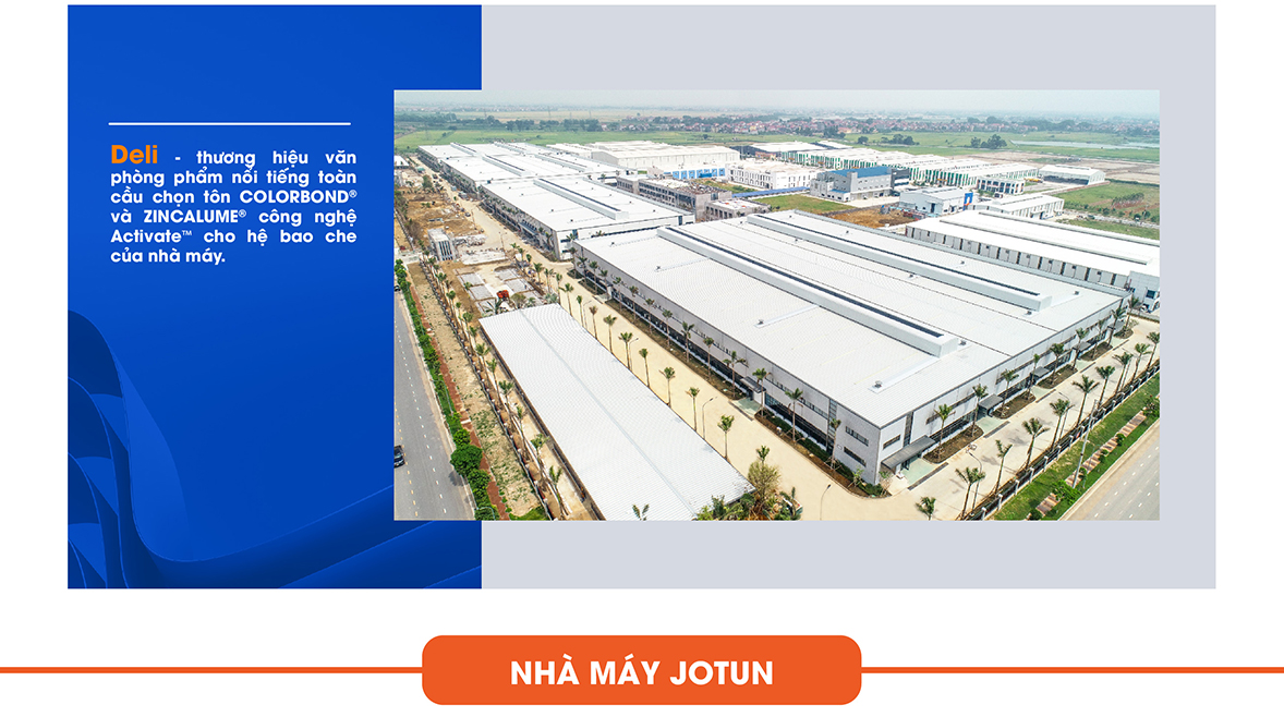 Một ông lớn khác – Deli – thương hiệu văn phòng phẩm nổi tiếng toàn cầu cũng chọn tôn công nghệ Activate™ cho phần mái và vách của nhà máy có quy mô 110.000m² tại Bắc Ninh. Đây là nhà máy đầu tiên của Deli tại Việt Nam, với tiêu chí lựa chọn vật liệu cao cấp để đảm bảo chất lượng công trình cũng như quá trình sản xuất, Tôn COLORBOND® công nghệ Activate™ là sự lựa chọn hoàn hảo của Deli, với khả năng chống ăn mòn vượt trội, mang lại vẻ đẹp bền vững với thời gian cho nhà máy và đặt dấu ấn của doanh nghiệp này tại đây.