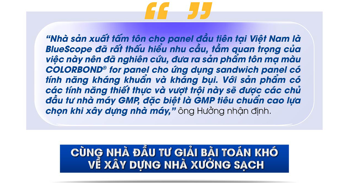 Bà Phạm Thị Thanh Hương, Tổng Giám đốc Công ty Cổ phần Dược trang thiết bị y tế Bình Định, chia sẻ ngay sau khi tham dự diễn đàn CEO “Nâng cao năng lực cạnh tranh ngành sản xuất dược” – do Tạp chí Kinh tế Sài Gòn tổ chức với sự đồng hành của NS BlueScope Việt Nam, bà đã đề nghị các cộng sự tìm hiểu về loại vật liệu mới để xây dựng nhà xưởng theo tiêu chuẩn sạch, kháng khuẩn. Sản phẩm doanh nghiệp quan tâm là vách cho phòng sạch COLORBOND® for Panel | Clean Room công nghệ khử khuẩn.