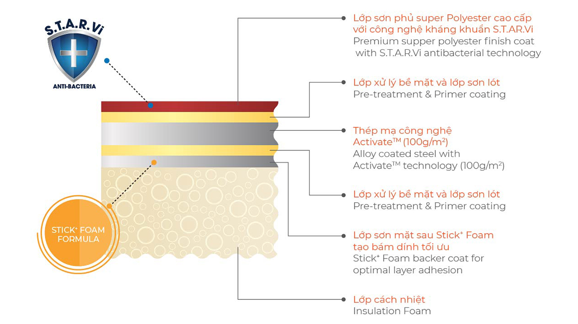 Không chỉ giải bài toán về “kháng khuẩn” bề mặt cho chủ đầu tư, dòng sản phẩm còn sở hữu lớp sơn mặt dưới STICK+ Foam có công thức đặc biệt, giúp tăng cường độ bám dính tối ưu lên bề mặt lớp cách nhiệt. Đồng thời, bề mặt thép mạ có độ bóng bề mặt hoàn hảo (chỉ 25%) giúp giảm hiện tượng chói và khuyết điểm bề mặt, tạo bề mặt panel phẳng hơn so với các sản phẩm thép mạ thông thường có độ bóng cao (45% – 60%).
