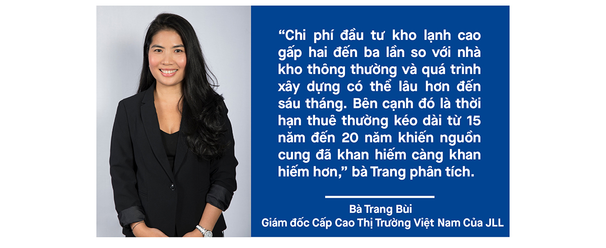 Bà Trang Bùi – Giám đốc Cấp cao Thị trường Việt Nam của JLL nêu ví dụ như lĩnh vực xuất khẩu thủy sản, ngành cần sử dụng nhiều diện tích kho lạnh nhất trong thời kỳ cao điểm của đại dịch, có tới 30% đến 50% đơn đặt hàng xuất khẩu thủy sản đã bị hủy, dẫn đến hàng tồn kho leo thang và các kho lạnh phải hoạt động công suất tối đa.