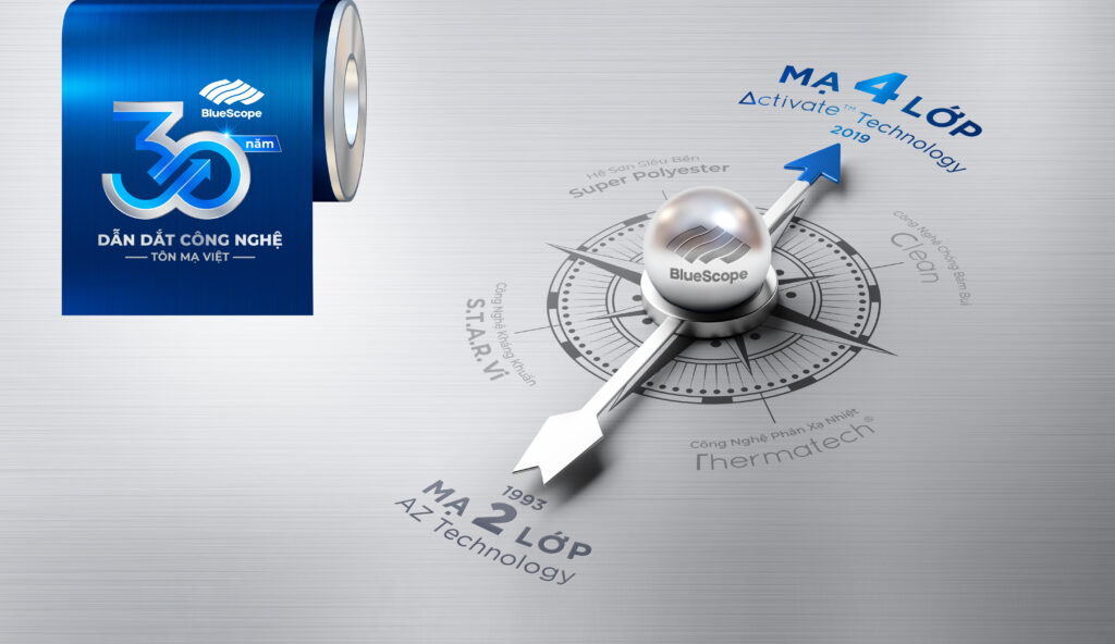 Năm 1993 – BlueScope lần đầu tiên đưa công nghệ mạ 2 lớp nhôm kẽm vào thị trường Việt Nam, khắc phục nhược điểm của công nghệ mạ 1 lớp cũ. Năm 2019 – BlueScope ra mắt công nghệ mạ AM – ACTIVATE™ ma trận 4 lớp chống ăn mòn vượt trội với khả năng tự trám, thách thức môi trường khắc nghiệt, bảo vệ công trình bền đẹp theo thời gian.