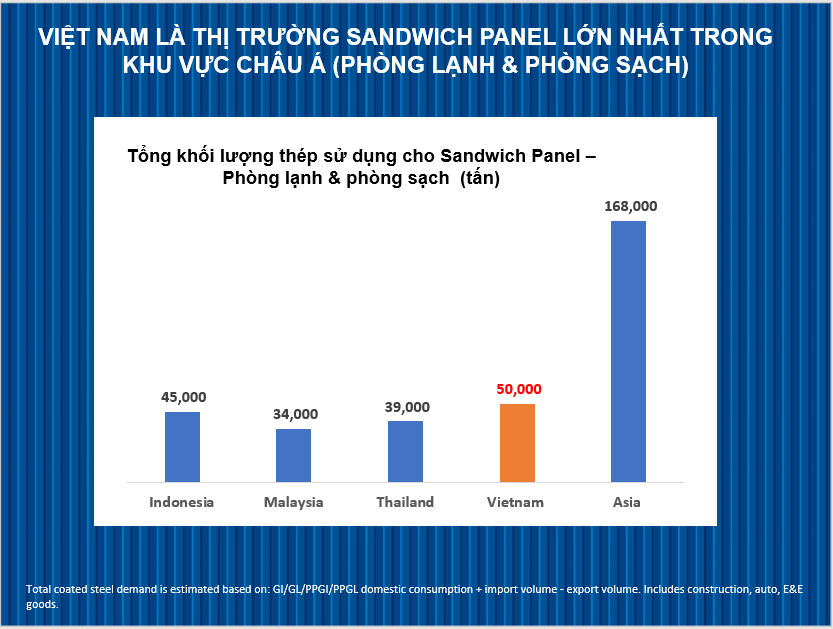 Xu hướng này đang được ứng dụng ở nhiều quốc gia trên thế giới trong việc xây dựng nhà máy, tại Hàn Quốc – Glass wool là đang sản phẩm ứng dụng sandwich panel được yêu thích nhất tại các nhà máy sản xuất. Theo kết quả nghiên cứu được thực hiện độc lập bởi đơn vị nghiên cứu thị trường SAI – Singapore và IPSOS Việt Nam, chỉ riêng năm 2018, tổng khối lượng thép sử dụng cho sandwich panel tại thị trường Đông Nam Á là 168,000 tấn, trong đó Việt Nam là thị trường sandwich panel lớn nhất trong khu vực (phòng lạnh và phòng sạch) chiếm khoảng 50,000 tấn.