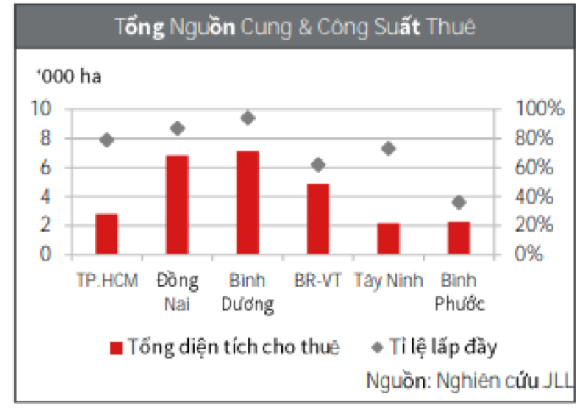 Trong báo cáo nghiên cứu thị trường quý 4/2018 của JLL cho biết, trong năm 2018 Bình Dương và Đồng Nai vẫn được xem là thị trường hàng đầu với khoảng 56% nguồn cung. Đến hết năm 2018 tổng diện tích đất khu công nghiệp của Thành phố Hồ Chí Minh vào khoảng 4.206ha, trong đó tỷ lệ lấp đầy là 79%. Còn Bình Dương có 10.774ha trong đó tỷ lệ lấp đầy đã đến 94%.