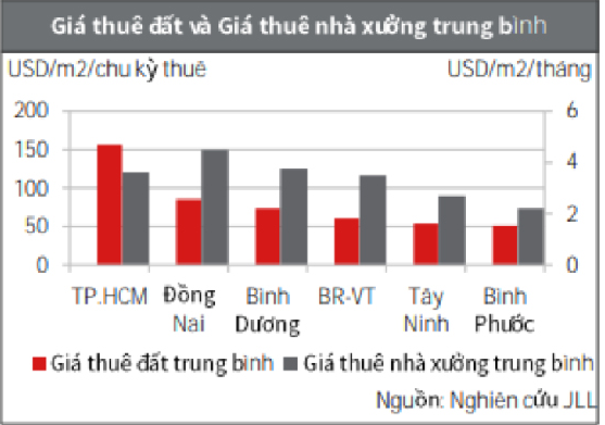 Giá thuê đất trung bình cũng đang có xu hướng tăng từ 4-6 USD/m2/chu kỳ thuê. Hiện bình quân giá thuê đất khu công nghiệp tại Sài Gòn đang rơi vào khoảng 156,8 USD/m2/chu kỳ thuê. Còn tại Đồng Nai đang là 85,5 USD và Bình Dương là 73,6 USD.