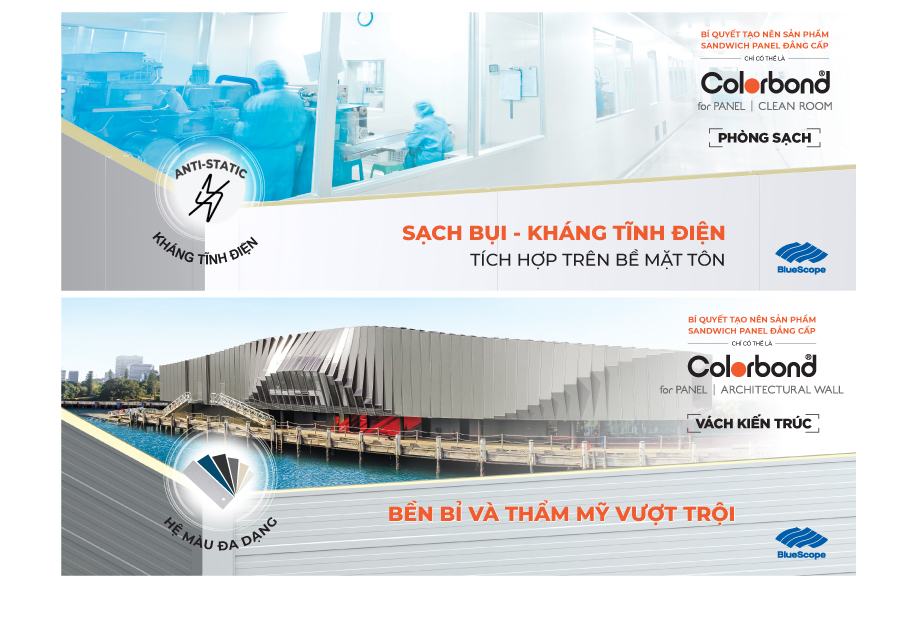 Dựa trên sự nghiên cứu về các vấn đề chủ đầu tư thường gặp phải trong quá trình xây dựng nhà xưởng kết hợp cùng kinh nghiệm chuyên sâu trong lĩnh vực sản xuất tôn mạ, BlueScope đã phát triển nên giải pháp tôn mạ COLORBOND® for Panel dành riêng cho phòng sạch và vách kiến trúc, đáp ứng tối ưu các yêu cầu khắt khe nhất về độ bền, khả năng kháng tĩnh điện (với giải pháp cho phòng sạch), tính thẩm mỹ, khả năng bám dính lớp cách nhiệt cùng nhiều tiêu chuẩn khác. Qua đó góp phần cùng với các nhà sản xuất tấm sandwich panel cho ra đời các sản phẩm chất lượng cao theo đúng yêu cầu của chủ đầu tư.