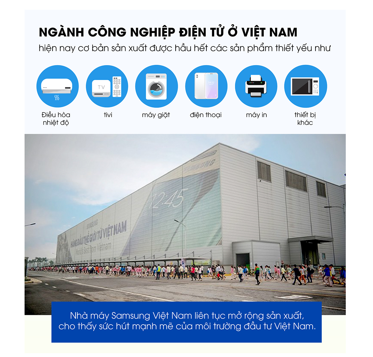 Sự phát triển của ngành điện tử đã thu hút các nhà đầu tư lớn từ các tập đoàn đa quốc gia của Hàn Quốc, Nhật Bản, Trung Quốc ở lĩnh vực sản xuất linh kiện điện tử.