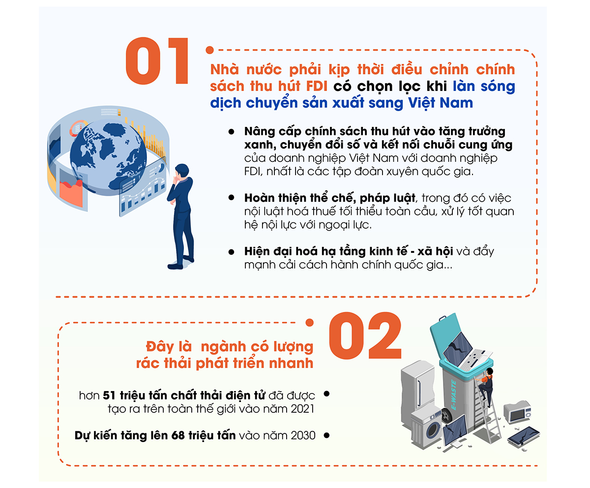 Công nghiệp điện tử là ngành công nghiệp trọng yếu trong nền kinh tế quốc dân, có vị trí then chốt và tác động lan tỏa mạnh mẽ đến các ngành công nghiệp khác, đồng thời là thước đo trình độ phát triển kinh tế – kỹ thuật của mọi quốc gia trên thế giới. Tại Việt Nam, hiện nhiều hãng điện tử lớn trên thế giới đã đầu tư xây dựng cơ sở sản xuất sản phẩm điện tử công nghệ cao như Samsung, LG, Foxconn, Fukang Technology, LG Display… Tuy nhiên, các doanh nghiệp sản xuất cũng phải đối mặt với rác thải điện tử. Làm gì để hướng đến việc phát triển bền vững nhưng thân thiện với môi trường?Công nghiệp điện tử là ngành công nghiệp trọng yếu trong nền kinh tế quốc dân, có vị trí then chốt và tác động lan tỏa mạnh mẽ đến các ngành công nghiệp khác, đồng thời là thước đo trình độ phát triển kinh tế – kỹ thuật của mọi quốc gia trên thế giới. Tại Việt Nam, hiện nhiều hãng điện tử lớn trên thế giới đã đầu tư xây dựng cơ sở sản xuất sản phẩm điện tử công nghệ cao như Samsung, LG, Foxconn, Fukang Technology, LG Display… Tuy nhiên, các doanh nghiệp sản xuất cũng phải đối mặt với rác thải điện tử. Làm gì để hướng đến việc phát triển bền vững nhưng thân thiện với môi trường?