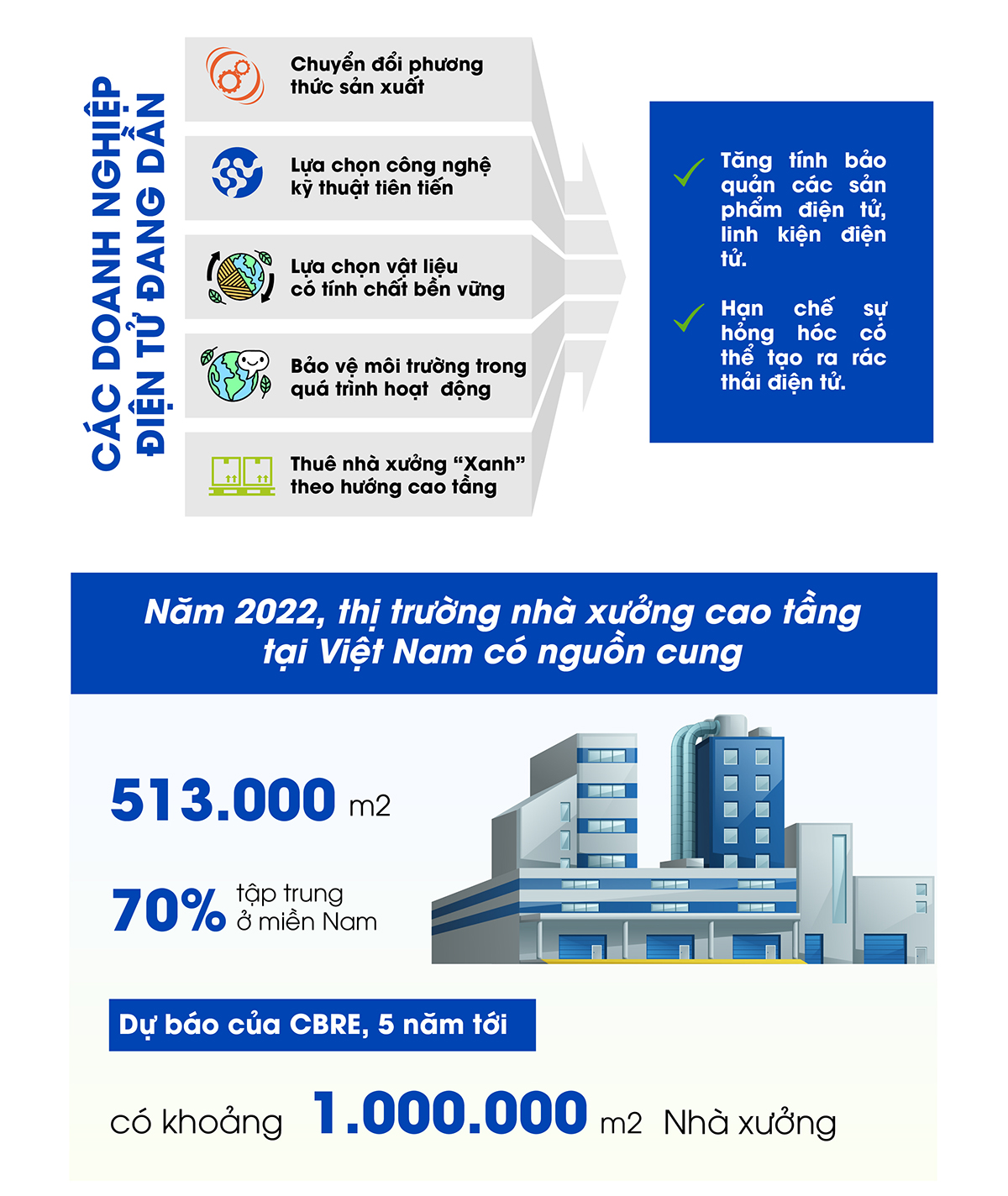 Bên cạnh những thách thức trên, các doanh nghiệp điện tử cũng đang dần chuyển đổi phương thức sản xuất, lựa chọn công nghệ kỹ thuật tiên tiến, vật liệu có tính chất bền vững, bảo vệ môi trường trong quá trình hoạt động. Ngoài ra, nhu cầu thuê nhà xưởng “xanh” theo hướng cao tầng hiện nay của các doanh nghiệp cũng ở mức cao trước bối cảnh diện tích đất cho xây dựng nhà máy, nhà kho ngày càng hạn hẹp.