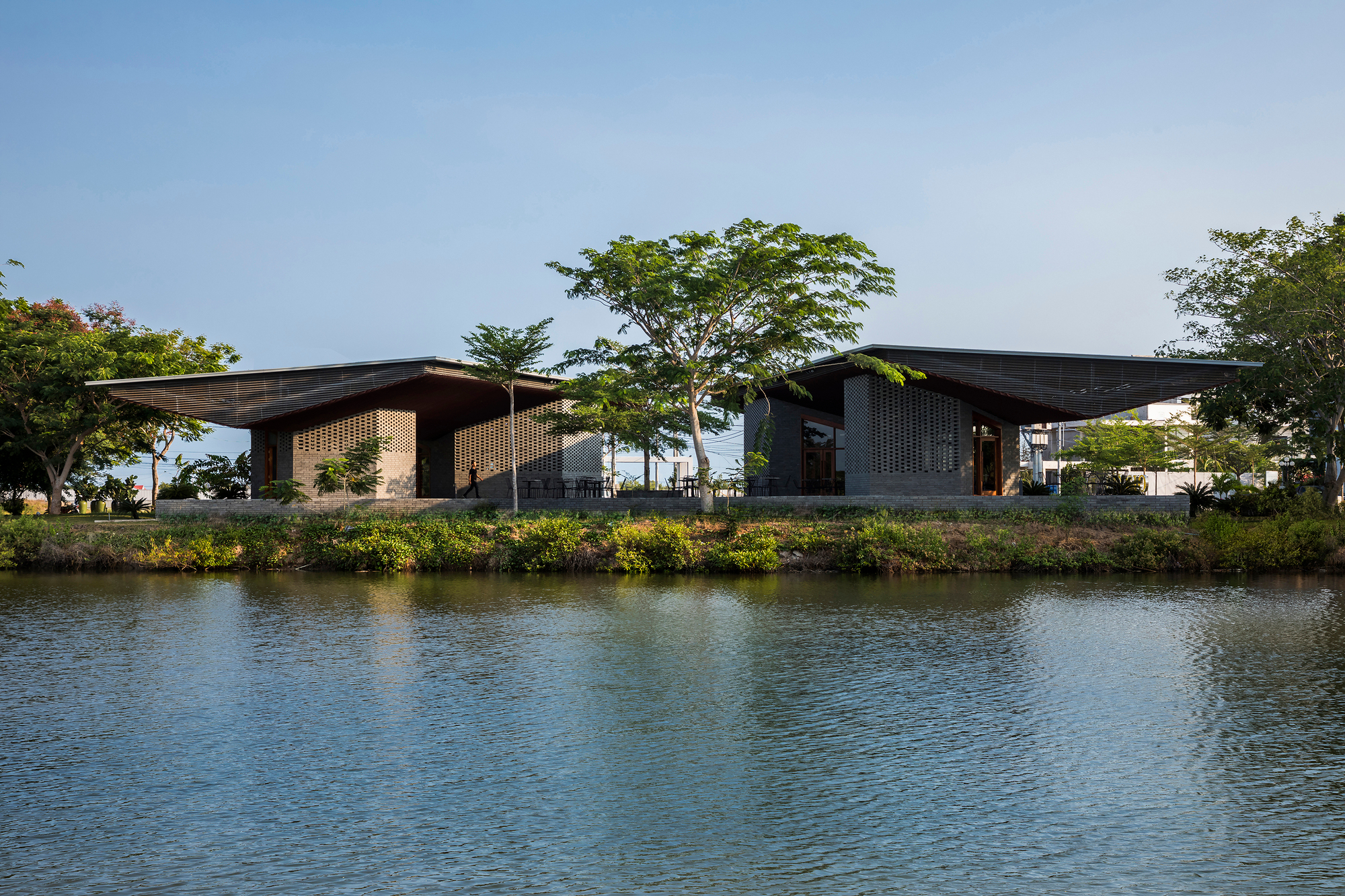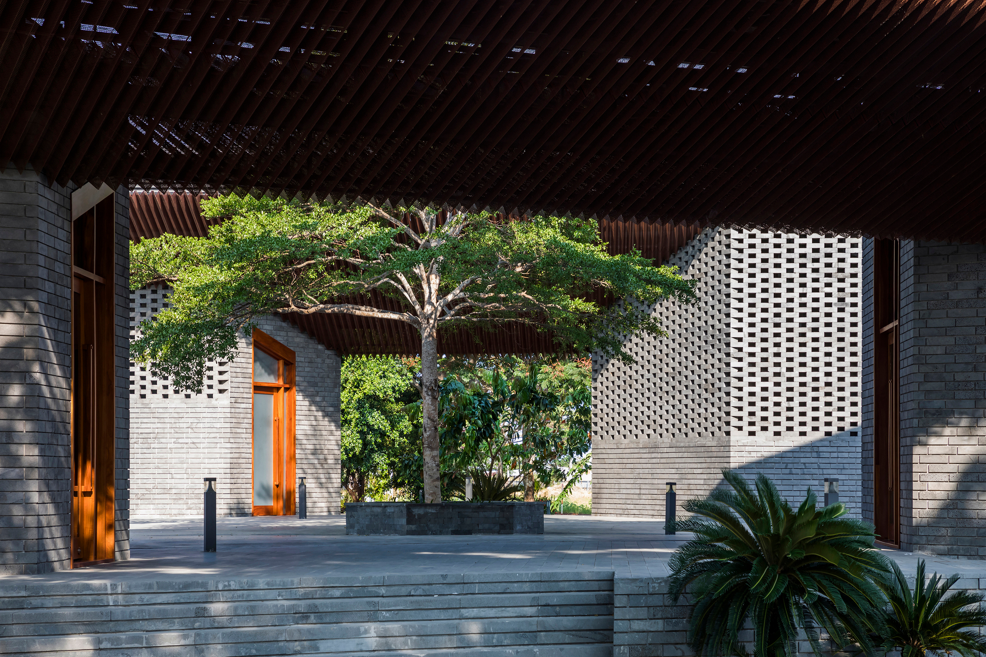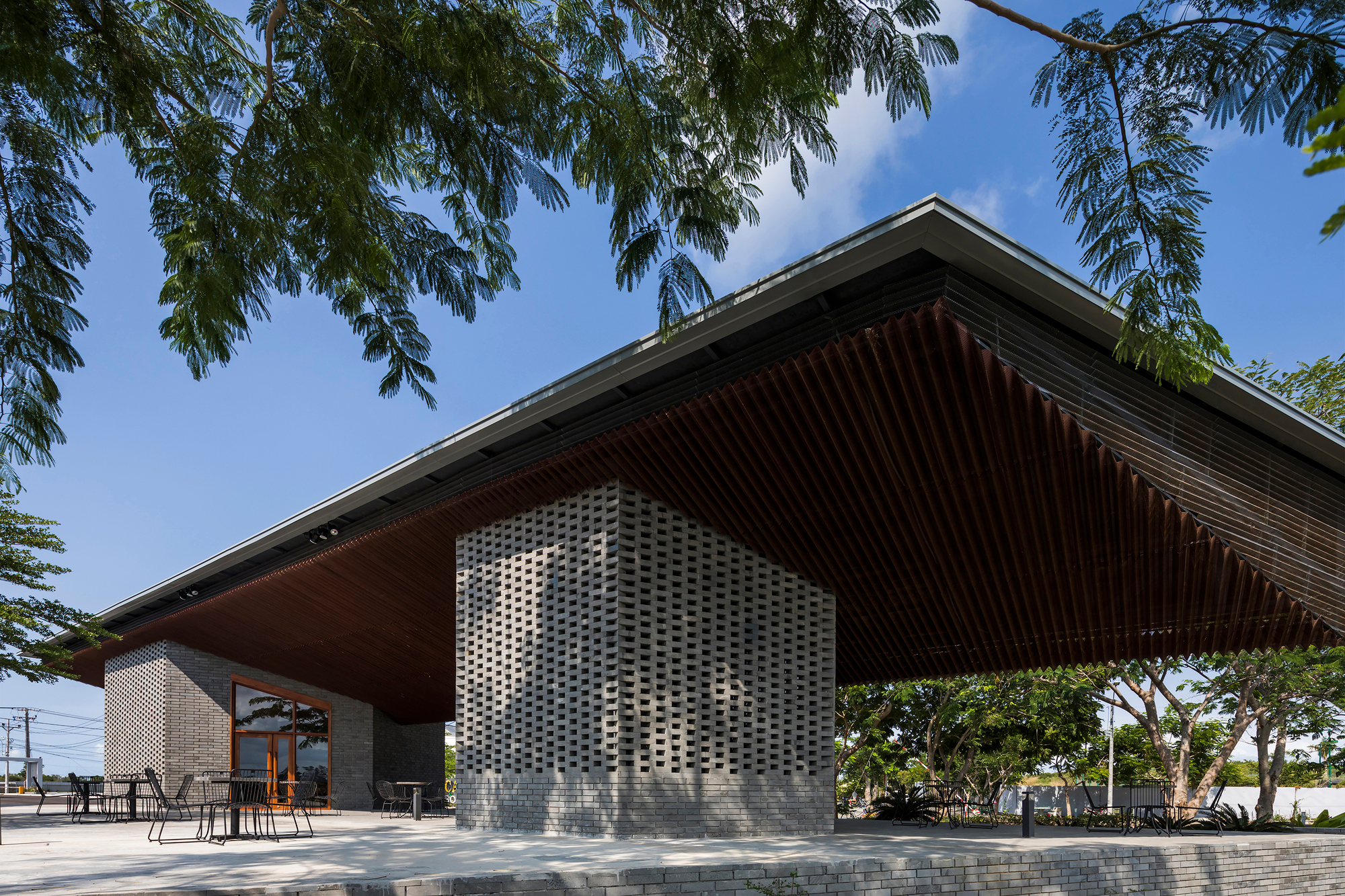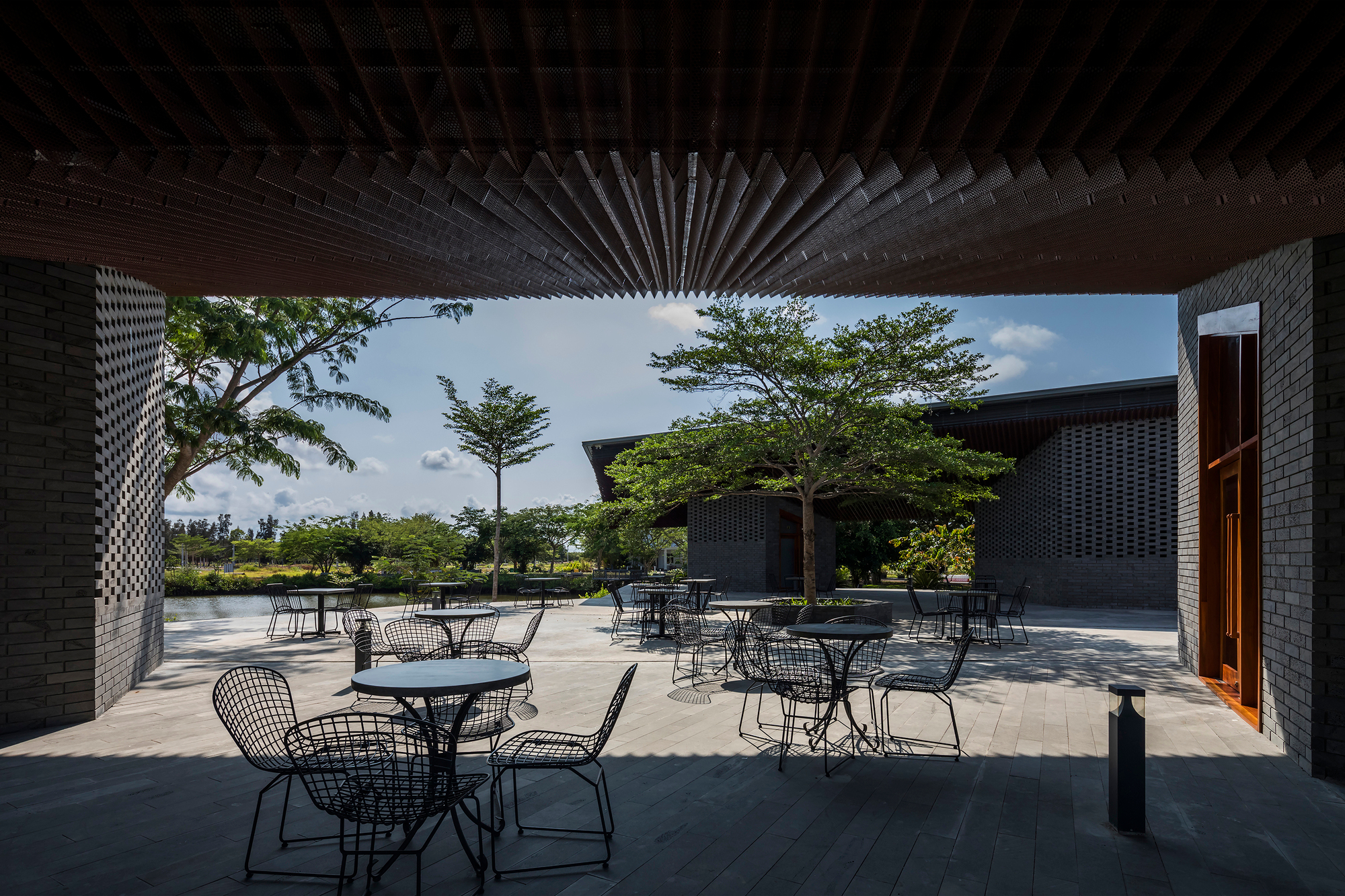 Dự án được thiết kế như một không gian công cộng mở, được che chắn khỏi ánh nắng gay gắt và mưa lớn đặc trưng của khu vực nhờ hai mái chữ V. Những mái lớn này hoạt động như một khung tranh, thu trọn vẻ đẹp của cảnh quan thiên nhiên xung quanh. Thiết kế tinh tế này thích ứng hoàn hảo với chương trình công năng mà chủ đầu tư mong muốn, nhằm tạo ra một khu vực đón tiếp thân thiện cho du khách và một không gian đa chức năng để tổ chức nhiều loại hình sự kiện khác nhau như: hội nghị, hội thảo, nhà hàng tạm thời được trang bị bếp chuyên nghiệp, các sự kiện dành cho nhóm đông người và các triển lãm theo mùa.
