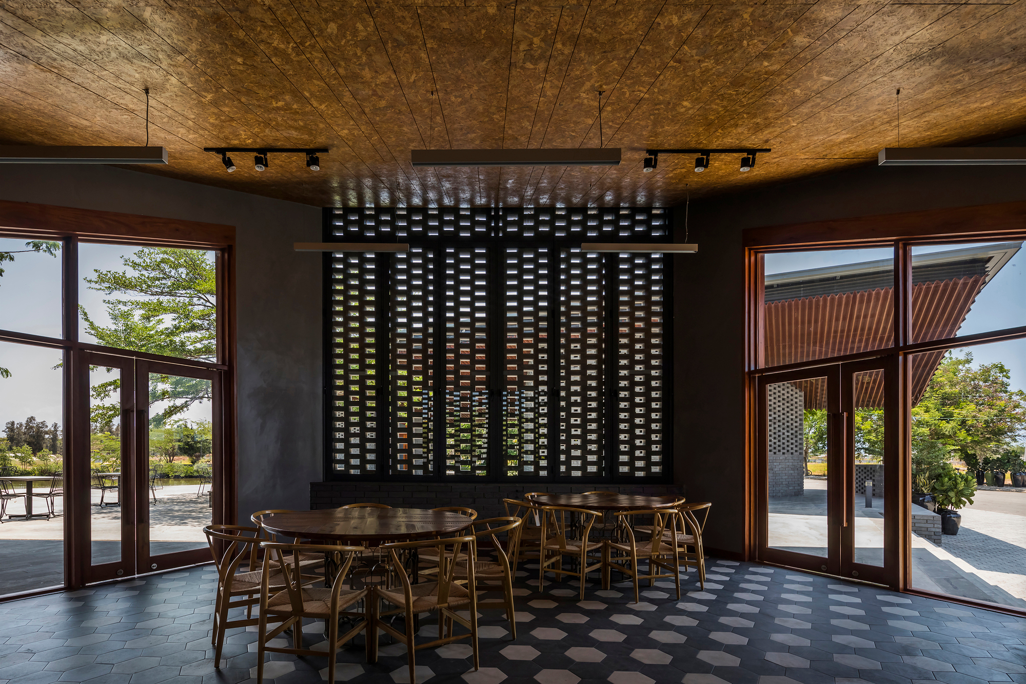 Các hạng mục chính của công trình bao gồm hai phòng ăn được trang bị hệ thống điều hòa không khí, một khu bếp lớn kèm kho lưu trữ và phòng lạnh, cùng các khu vệ sinh. Mô hình này bổ sung cho quy hoạch du lịch vốn chủ yếu chỉ bao gồm khách sạn, khu nghỉ dưỡng có hồ bơi, nhà phố và biệt thự, qua đó mang đến thêm một lựa chọn thư giãn, nghỉ ngơi ngắn ngày cho người dân rời khỏi Thành phố Hồ Chí Minh vào dịp cuối tuần. Công trình cần thích ứng với điều kiện nắng gắt làm phai màu cảnh quan xung quanh, những cơn mưa lớn và giông bão từ Biển Đông, cũng như gió khô. Màu sắc của dự án được lấy cảm hứng từ màu cát đặc trưng của địa phương và rễ cây rừng ngập mặn. Ngoài ra, công trình còn sử dụng tông xám nhạt tương tự màu phù sa, giúp làm nổi bật sắc xanh đậm của thảm thực vật rừng ngập mặn.