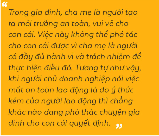 Việt Nam có một thực tế trái ngược với các quốc gia phát triển trên thế giới. Khi tai nạn xảy ra, chủ doanh nghiệp thường nói do nhận thức của người lao động kém, nhưng thực ra đó là hệ quả của tổ chức. Ở các nước phát triển, công tác toàn lao động bắt buồn từ người lãnh đạo doanh nghiệp với vai trò là người định hướng, xây dựng môi trường an toàn cho doanh nghiệp. Chủ doanh nghiệp ở các nước này có thể ủy quyền mọi vấn đề ngoại trừ an toàn lao động. Và cũng chỉ khi lãnh đạo doanh nghiệp hiểu được tầm quan trọng của an toàn lao động thì họ mới đầu tư bài bản cho công tác này.