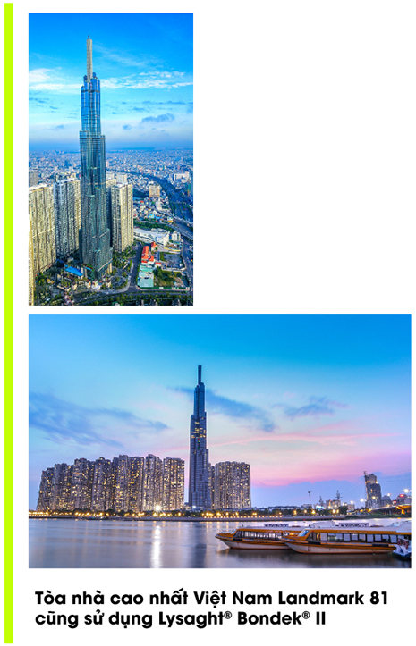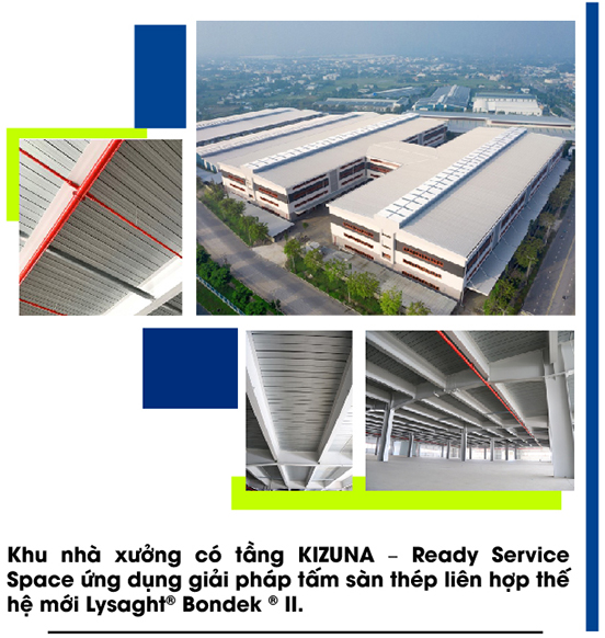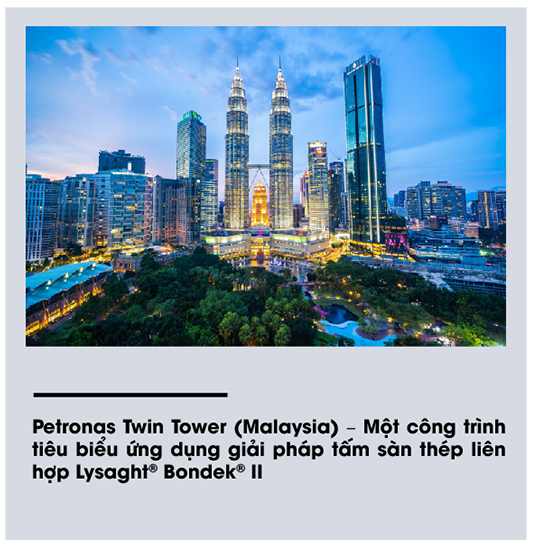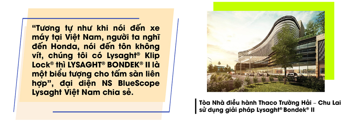Nắm bắt được xu hướng mới, kết hợp với sự am hiểu sâu sắc về thị trường xây dựng Việt Nam, từ năm 2017, NS BlueScope Lysaght ra mắt LYSAGHT® BONDEK® II – Một trong những giải pháp tiên tiến nhất đến từ Úc, giúp thay thế tấm cốp pha truyền thống và lớp thép dưới trong hệ sàn công trình. Giải pháp này không chỉ được ứng dụng rộng rãi cho các công trình mang tính biểu tượng trên thế giới như Marina Bay Sand (Singapore), Sân bay Changi Singapore, Tòa tháp đôi Petronas Twin Tower ở Malaysia, tòa nhà One Shelley Street (Úc) kiến trúc độc đáo … mà còn cho các công trình công nghiệp tại Việt Nam như tòa nhà văn phòng điều hành Thaco Trường Hải – Quảng Nam, Long Beach Resort – Phú Quốc, Nhà xưởng có tầng Kizuna – Long An, Milennium – Quảng Ngãi, tòa nhà cao nhất Việt Nam “Landmark 81” – niềm tự hào của người Việt…