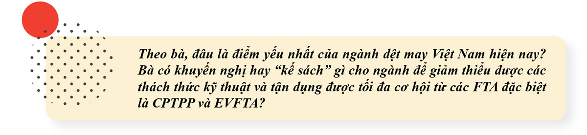 Theo phần lớn đánh giá từ các chuyên gia và báo chí, điểm yếu của các DN dệt may là chưa chủ động được yếu tố nguyên liệu đầu vào, do phải nhập khẩu từ nước ngoài, không là thành viên của FTA sẽ không được hưởng ưu đãi về thuế quan. Theo góc độ cá nhân, tôi cho rằng còn nằm ở chính tính kết nối chuỗi cung ứng trong ngành.