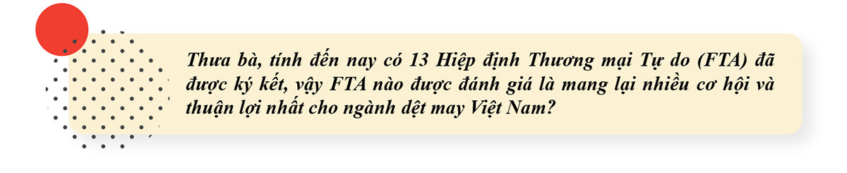 Rất khó để kết luận ngành dệt may có thể hưởng lợi nhiều nhất từ FTA nào, do việc tối đa hóa lợi ích của FTA phụ thuộc phần lớn vào trình độ và khả năng đáp ứng của DN đối với các quy định trong mỗi FTA, khả năng tự chủ về nguồn cung hay nói cách khác là giá trị chuỗi cung ứng (value supply chain) và khả năng làm chủ công nghệ của DN.