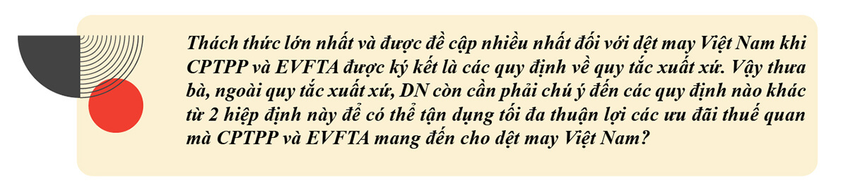 Quy tắc xuất xứ luôn là vấn đề then chốt, cốt lõi của bất kỳ một Hiệp định/ Thỏa thuận Thương mại Tự do nào, trong đó có CPTPP và EVFTA. DN cần tập trung nhiều nhất vào Quy tắc xuất xứ để có thể tận dụng được tối đa các thuận lợi của CPTPP và EVFTA.