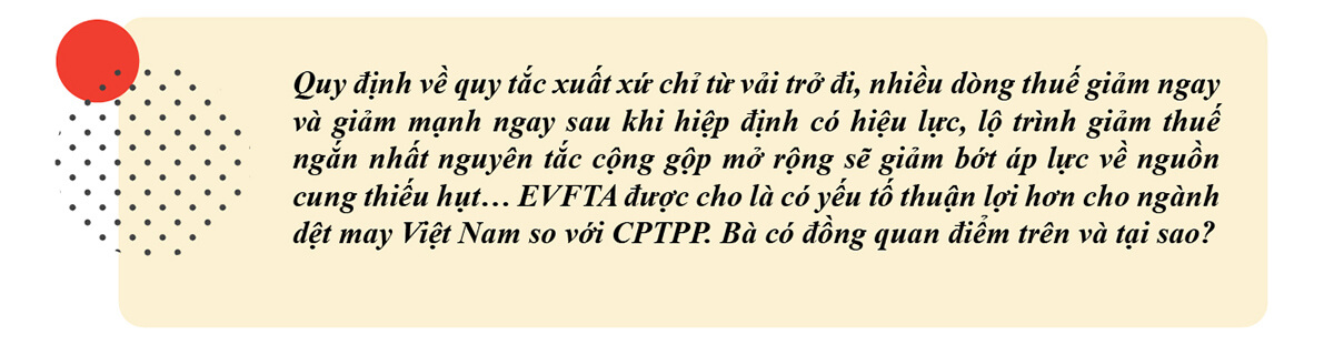 Tôi đồng ý với quan điểm này. Thứ nhất, Hiệp định EVFTA có yếu tố thuận lợi hơn CPTPP ở điểm cho phép cộng gộp bên thứ ba. Cụ thể cho phép nếu một nền kinh tế đồng thời cùng lúc có FTA với Việt Nam và EU, Việt Nam có thể cộng gộp các nguyên phụ liệu đầu vào từ nền kinh tế này khi xuất khẩu sang EU để hưởng ưu đãi theo EVFTA. Ví dụ Hàn Quốc và Singapore là hai nền kinh tế đồng thời có FTA với Việt Nam (ASEAN) và có FTA với EU, Việt Nam có thể cộng gộp vải có xuất xứ từ 2 nước này, khi xuất khẩu sang EU sẽ được hưởng ưu đãi theo EVFTA, mặc dù Singapore và Hàn Quốc không phải là thành viên của EVFTA. Điểm này thuận lợi hơn CPTPP vì hiệp định này không cho phép cộng gộp từ bất kỳ nền kinh tế nào không phải là thành viên hiệp định. Tuy nhiên trên thực tế việc cộng gộp từ hai quốc gia này rất hạn chế do hàm lượng nhập khẩu nguyên phụ liệu từ Singapore và Hàn Quốc là không cao.