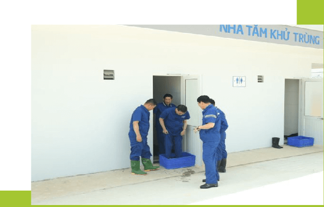 Ngoài ra, để đảm bảo an toàn sinh học, quy trình khử trùng tại nhà máy đặc biệt nghiêm ngặt với 5 bước mà bất kỳ nhân viên nào cũng phải thực hiện. Từ việc “tắm khử trùng” cho xe ngay từ cổng vào.
