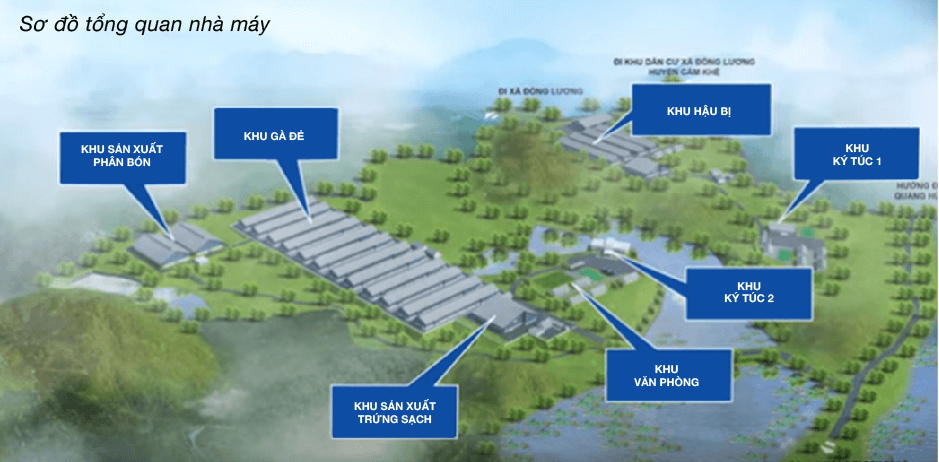 Nhà máy được xây dựng trên diện tích hơn 42ha tại Phú Thọ, cách Hà Nội khoảng 100km với tổng mức đầu tư 800 tỷ đồng, công suất 175 triệu quả trứng/năm. Nhà máy được xây dựng trong một “vùng đệm” sinh học giúp toàn bộ nhà máy được cách ly với xung quanh, tránh tác động xấu và lây nhiễm bệnh từ gia cầm bên ngoài.