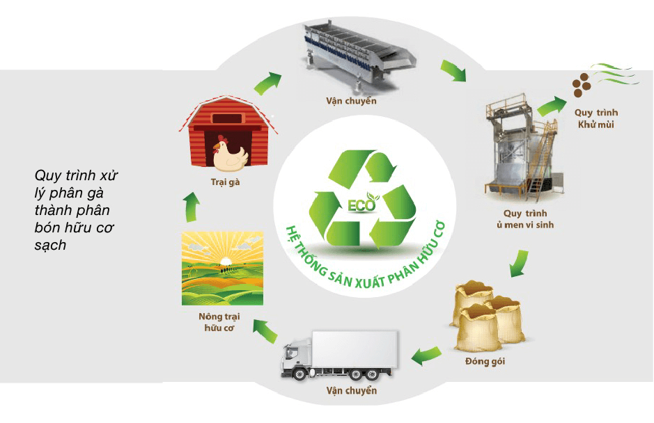 Toàn bộ phân gà của nhà máy đều được thu gom và xử lý theo phương pháp lên men vi sinh với dây chuyền được nhập khẩu từ hãng Ecotech của Nhật, tạo ra sản phẩm phân bón hữu cơ sạch.