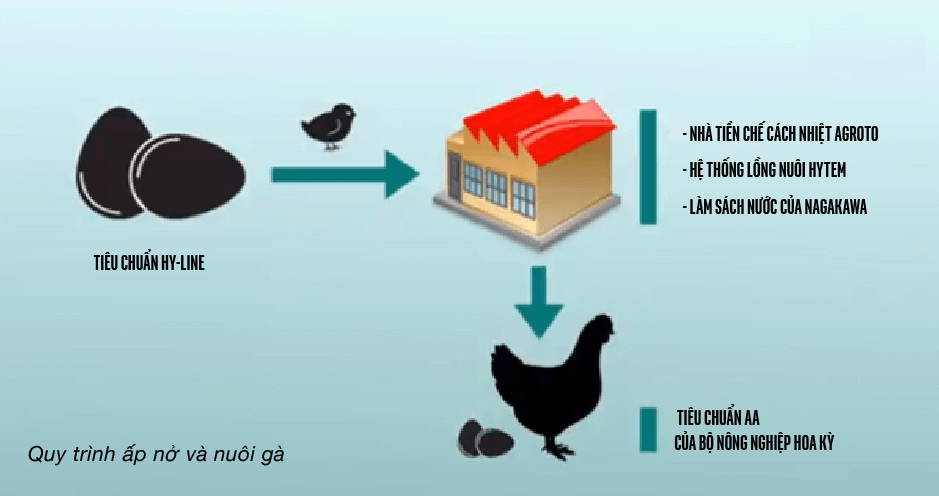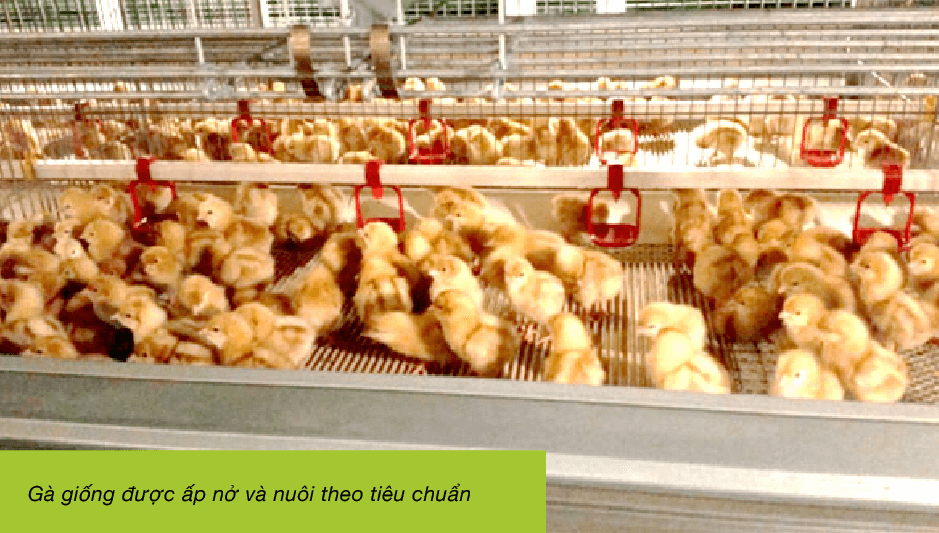 Giống gà Hy-Line được ấp nở, và nuôi theo tiêu chuẩn trước khi đưa về khu vực cho gà đẻ trứng. Đàn gà thương phẩm sau đó được đưa đến khu vực sản xuất trứng gà sạch để bắt đầu quy trình khai thác sản xuất trứng gà.