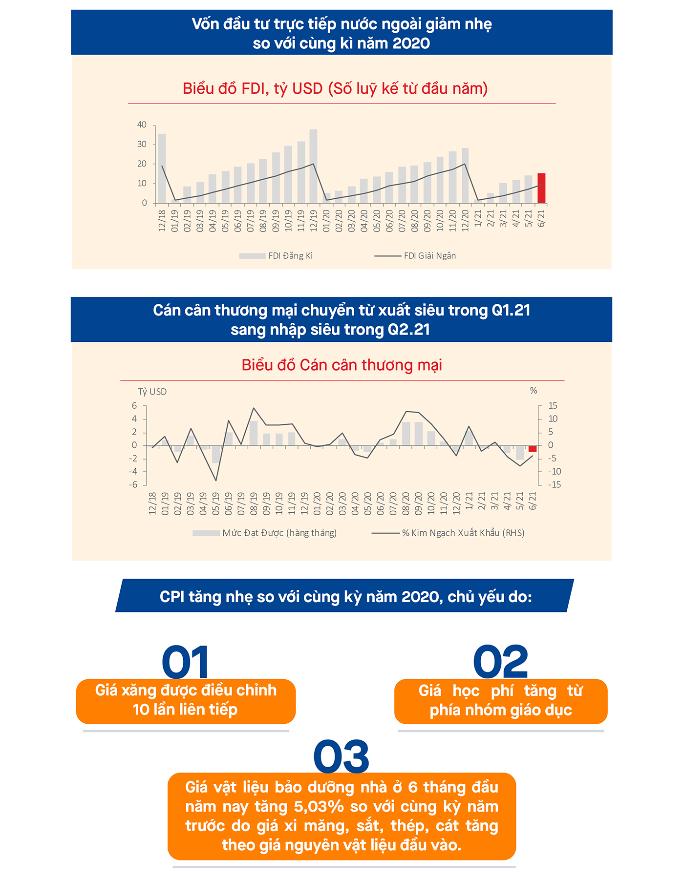 Trong quý II của năm 2021, Việt Nam tiếp tục ghi nhận mức tăng trưởng khả quan ,GDP Q2.21 ước tính tăng 6,61% so với cùng kỳ năm trước, thúc đẩy GDP 6 tháng đầu năm 2021 tăng 5,64%, cao hơn tốc độ tăng 1,82% của 6 tháng đầu năm 2020, tuy nhiên vẫn thấp hơn tốc độ của những năm trước dịch Covid-19.