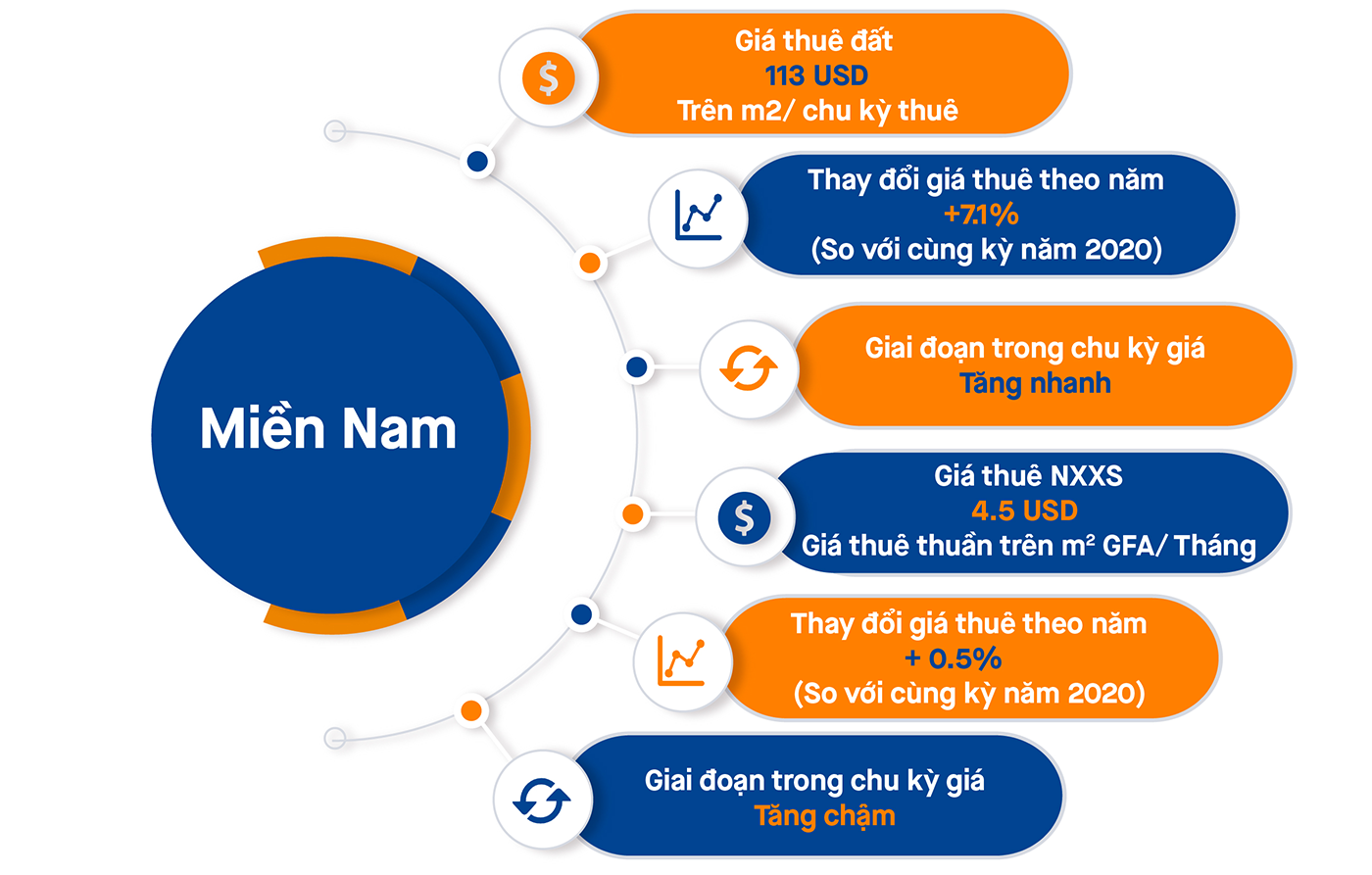 Tại khu vực miền Nam, theo báo cáo của JLL Việt Nam tỷ lệ lấp đầy KCN và NXXS lần lượt đạt 85% và 86%; vẫn giữ mức ổn định với nhiều giao dịch được hoàn thành tại Bà Rịa – Vũng Tàu bất chấp làn sóng Covid thứ 4, chủ yếu đến từ các nhà sản xuất công nghiệp nặng cần quỹ đất lớn. Có thể thấy rằng cả chủ đầu tư và khách thuê đã dần tìm ra các phương án đồng hành để tiếp tục hoạt động trong đại dịch. Ngược lại, NXXS ghi nhận sự mở rộng kinh doanh của các doanh nghiệp hiện hữu hơn những doanh nghiệp mới. Với các số liệu trên, có thể thấy đất công nghiệp là hình thức đầu tư sản xuất lâu dài vẫn luôn giữ đà tăng trưởng mạnh mẽ qua các năm, trong khi giá thuê NXXS bị chững lại gây ảnh hưởng nghiêm trọng đối với loại hình BĐS xây sẵn này.