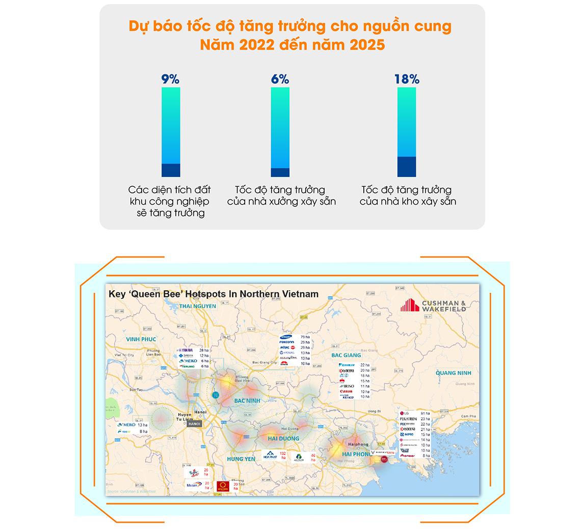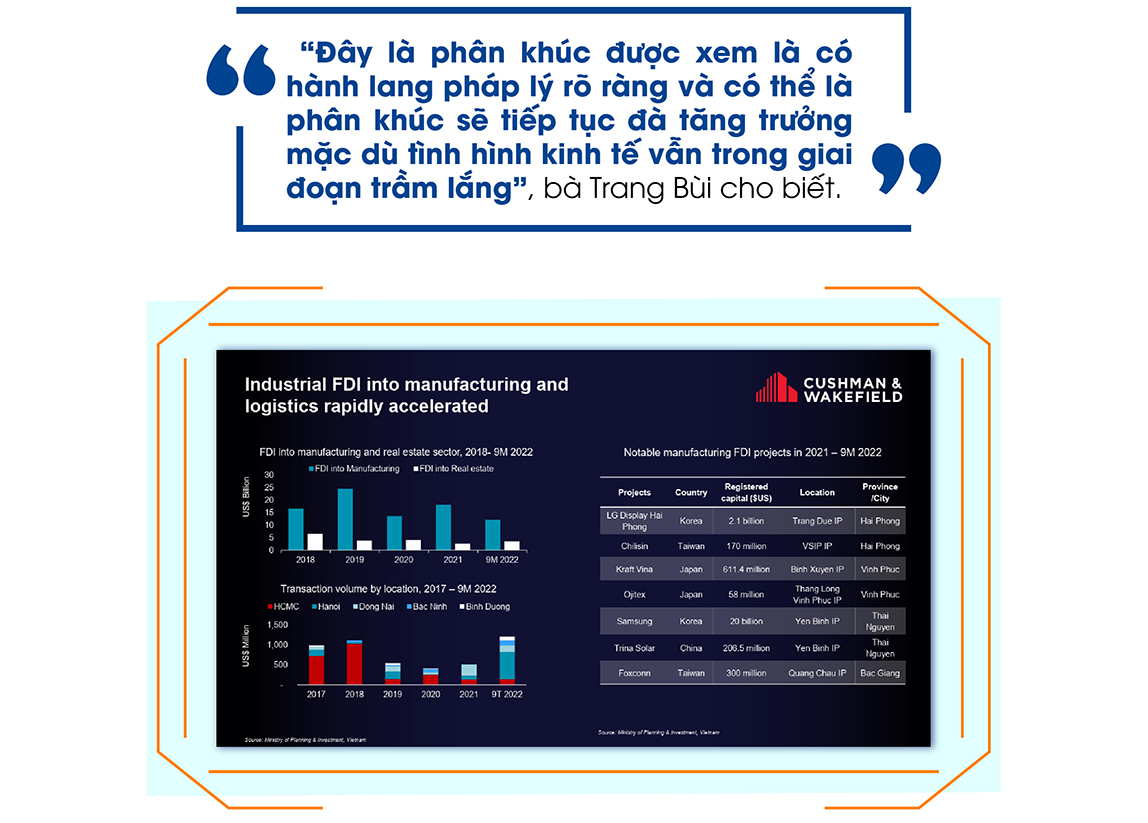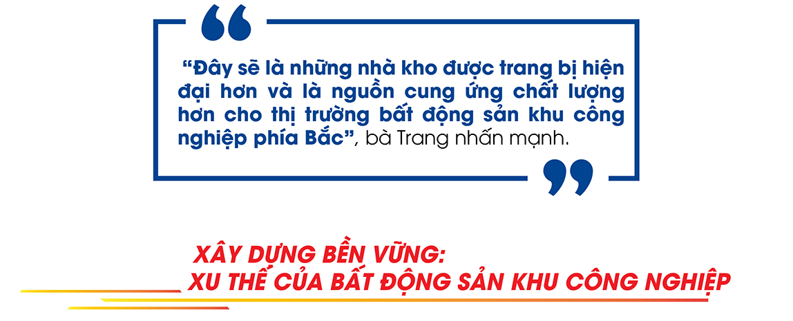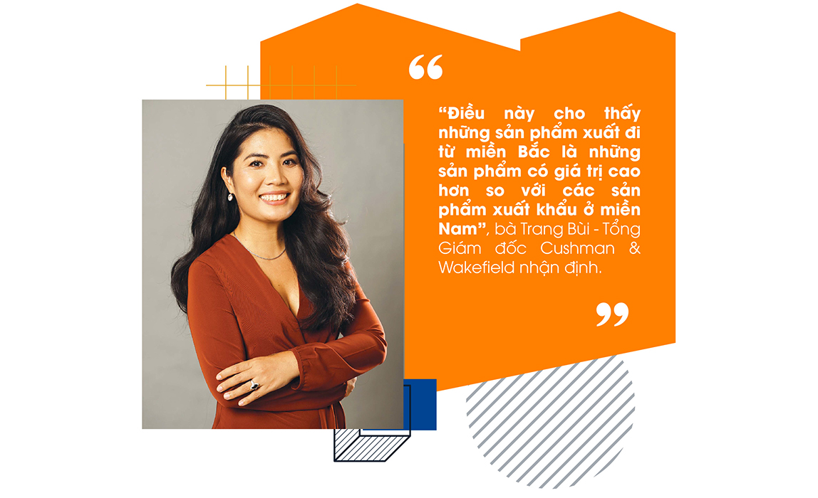 Vốn đầu tư nước ngoài vào bất động sản cũng có sự tăng trưởng ổn định, với sự dịch chuyển dần ra khu vực phía Bắc bắt đầu từ năm 2018. Nhiều Tập đoàn đa quốc gia như LG, Samsung, Foxcom tiếp tục cam kết đầu tư vào khu vực này. Đánh giá về thị thường bất động sản khu công nghiệp phía Bắc, bà Trang Bùi cho biết: Miền Bắc có nguồn cung bất động sản khu công nghiệp hơn hơn 13 nghìn hecta đất, trong đó trọng điểm là Bắc Ninh và Hải Phòng – nguồn cung ứng chính cho các nhà xưởng xây sẵn và nhà kho xây sẵn.