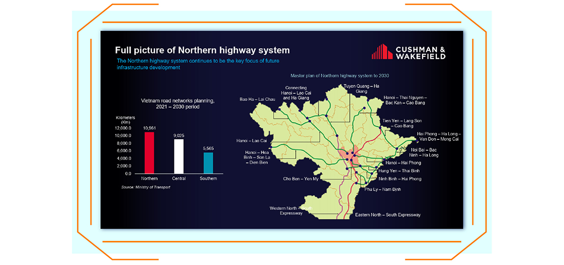 So sánh lượng hàng hóa thông quan đi qua đường bộ trong 5 năm từ 2018 đến 2022, lượng hàng hóa thông quan các vùng kinh tế trọng điểm ở miền Bắc gần như gấp đôi so với miền Nam. Thực tế này chứng minh cơ sở hạ tầng về đường bộ, các tuyến cao tốc ở miền Bắc đã phát triển vượt trội. Đặc biệt là, dự kiến đến năm 2030, chính phủ vẫn tập trung phát triển cơ sở hạ tầng đường bộ, các tuyến cao tốc kết nối liên vùng, nội vùng và đi ra khỏi miền Bắc tới các vùng kinh tế trọng điểm khác của cả nước với chiều dài gần 11,000 km.