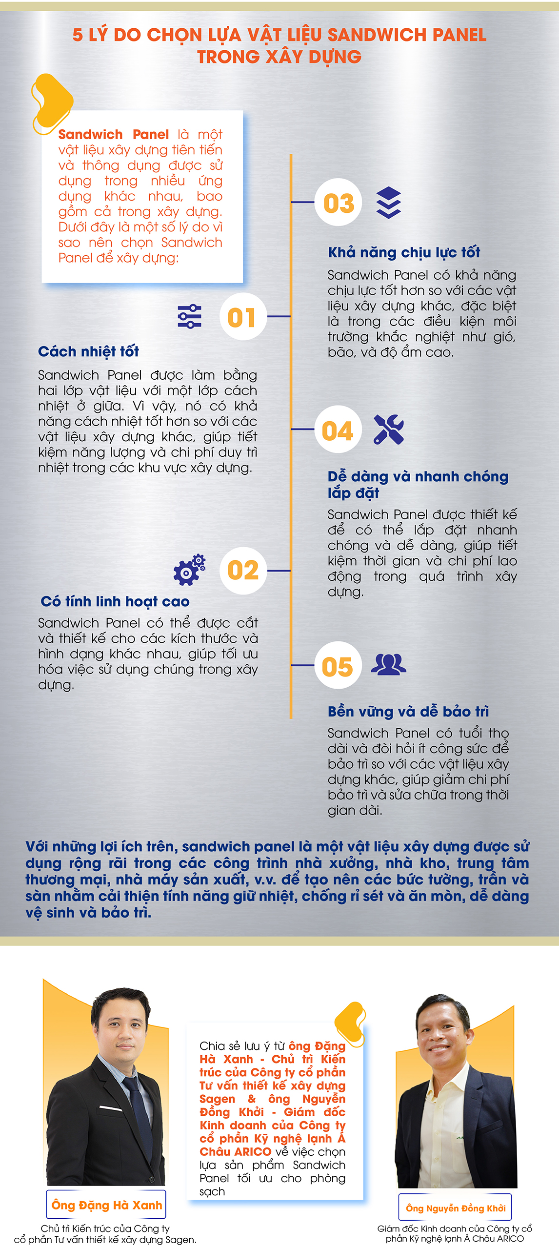 Điều này đặc biệt đúng trong trường hợp xây dựng phòng sạch, nơi mà sự chính xác và độ chắn chắn của kết cấu đóng vai trò rất quan trọng để đảm bảo hiệu quả của công trình. Vì vậy, việc lựa chọn và sử dụng Sandwich Panel phù hợp trong xây dựng phòng sạch cần được chú ý để đảm bảo tính thẩm mỹ, tính kháng khuẩn, cách âm, tiết kiệm năng lượng và đáp ứng đầy đủ các tiêu chuẩn về an toàn và môi trường.